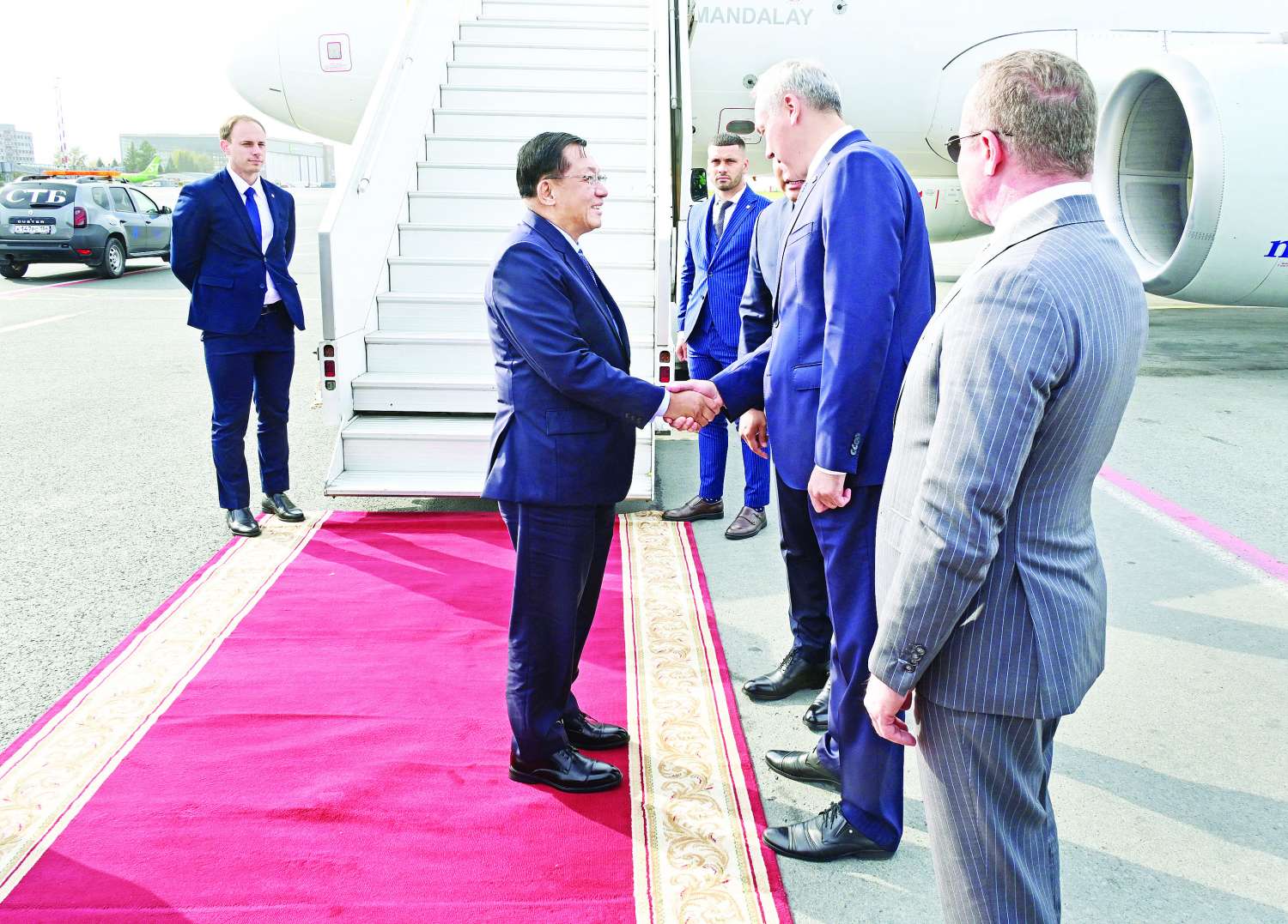 ထို့နောက် ပြည်ထောင်စုသမ္မတမြန်မာနိုင်ငံတော် ယာယီသမ္မတ နိုင်ငံတော်လုံခြုံရေးနှင့် အေးချမ်းသာယာရေးကော်မရှင်ဥက္ကဋ္ဌနှင့် အဖွဲ့ဝင်များ လိုက်ပါလာသည့် အထူးလေယာဉ်သည် ရုရှားဖက်ဒရေးရှင်းနိုင်ငံ နိုဗာစီဗစ်မြို့ သာမာရှယ်ဗာလေဆိပ်၌ ခေတ္တရပ်နားခဲ့ရာ နိုဗာစီဗစ်ဒေသအုပ်ချုပ်ရေးမှူး Mr. Travnikov Ahdrey Aleksandrovich နှင့် တာဝန်ရှိသူများက လေဆိပ်၌ ကြိုဆိုနှုတ်ဆက်ခဲ့ကြသည်။