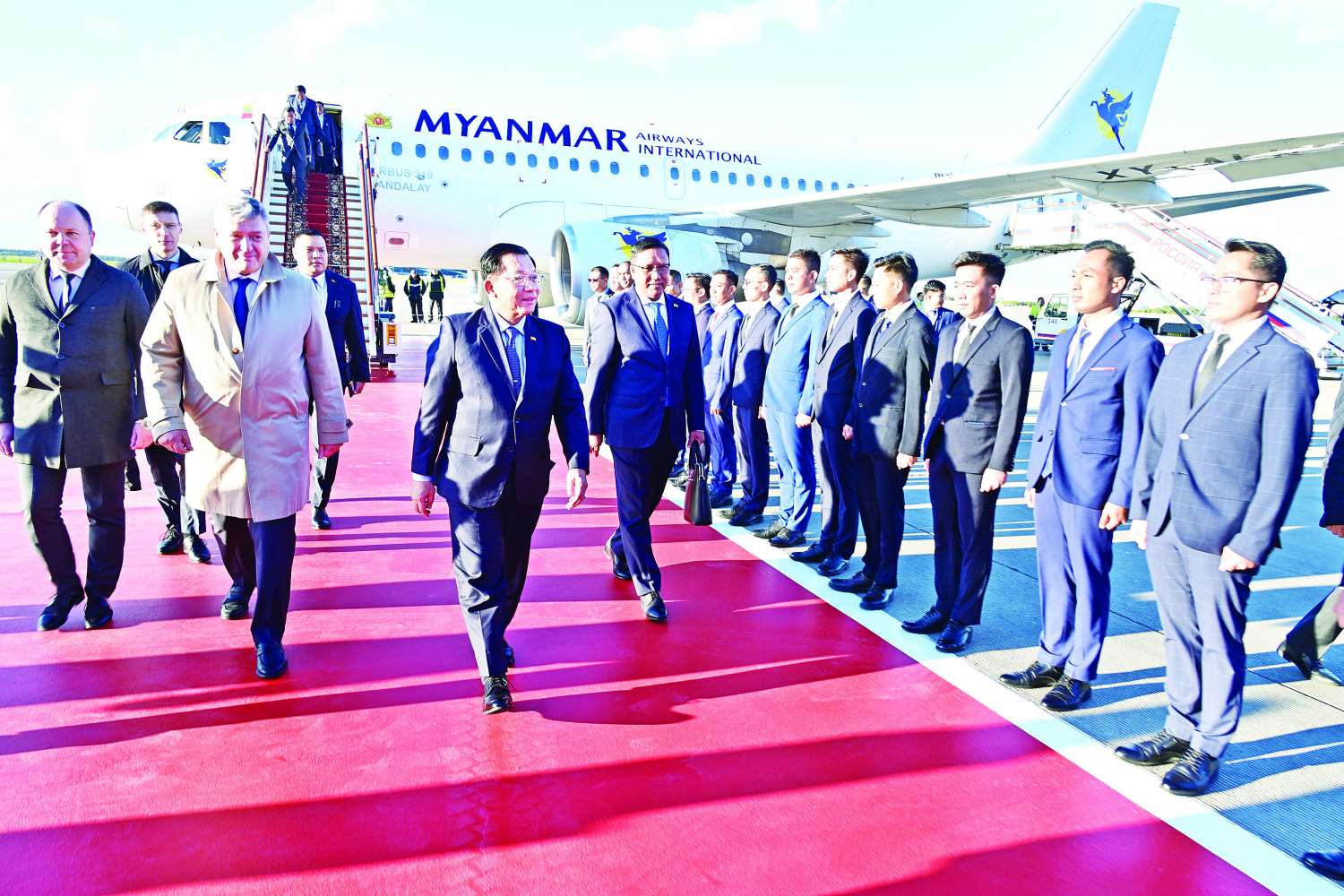 ရုရှားဖက်ဒရေးရှင်းနိုင်ငံသမ္မတ မစ္စတာ ဗလာဒီမာပူတင်၏ ဖိတ်ကြားချက်အရ ရုရှားဖက်ဒရေးရှင်းနိုင်ငံ မော်စကိုမြို့၌ ကျင်းပပြုလုပ်မည့် ကမ္ဘာ့အဏုမြူသီတင်းပတ်ဖိုရမ်-၂၀၂၅ (World Atomic Week Forum 2025) သို့ တက်ရောက်ရန်အတွက် ပြည်ထောင်စုသမ္မတမြန်မာနိုင်ငံတော် ယာယီသမ္မတ နိုင်ငံတော်လုံခြုံရေးနှင့်အေးချမ်းသာယာရေးကော်မရှင်ဥက္ကဋ္ဌ ဗိုလ်ချုပ်မှူးကြီး မင်းအောင်လှိုင် ဦးဆောင်သည့် မြန်မာအဆင့်မြင့် ကိုယ်စားလှယ်အဖွဲ့သည် ယနေ့နံနက်ပိုင်းတွင် အထူးလေယာဉ်ဖြင့် နေပြည်တော်တပ်မတော်လေဆိပ်မှ ထွက်ခွာသည်။