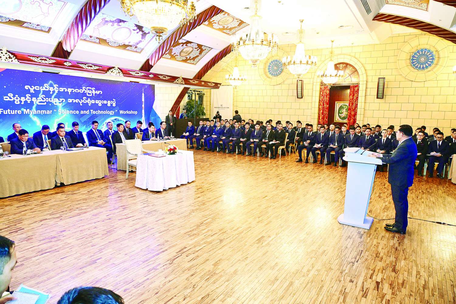 “လူငယ်နှင့်အနာဂတ်မြန်မာ-သိပ္ပံနှင့်နည်းပညာ” ခေါင်းစဉ်ဖြင့် သိပ္ပံပညာရပ်ဆိုင်ရာ အလုပ်ရုံဆွေးနွေးပွဲကို ယနေ့နံနက်ပိုင်းတွင် ရုရှားဖက်ဒရေးရှင်းနိုင်ငံမော်စကိုမြို့ RADISSON COLLECTION ဟိုတယ်၊ Conference Hall ၌ ကျင်းပပြုလုပ်ရာ ပြည်ထောင်စုသမ္မတမြန်မာနိုင်ငံတော်ယာယီသမ္မတ နိုင်ငံတော်လုံခြုံရေးနှင့်အေးချမ်းသာယာရေးကော်မရှင်ဥက္ကဋ္ဌ ဗိုလ်ချုပ်မှူးကြီး မင်းအောင်လှိုင်တက်ရောက်အမှာ စကားပြောကြားသည်။