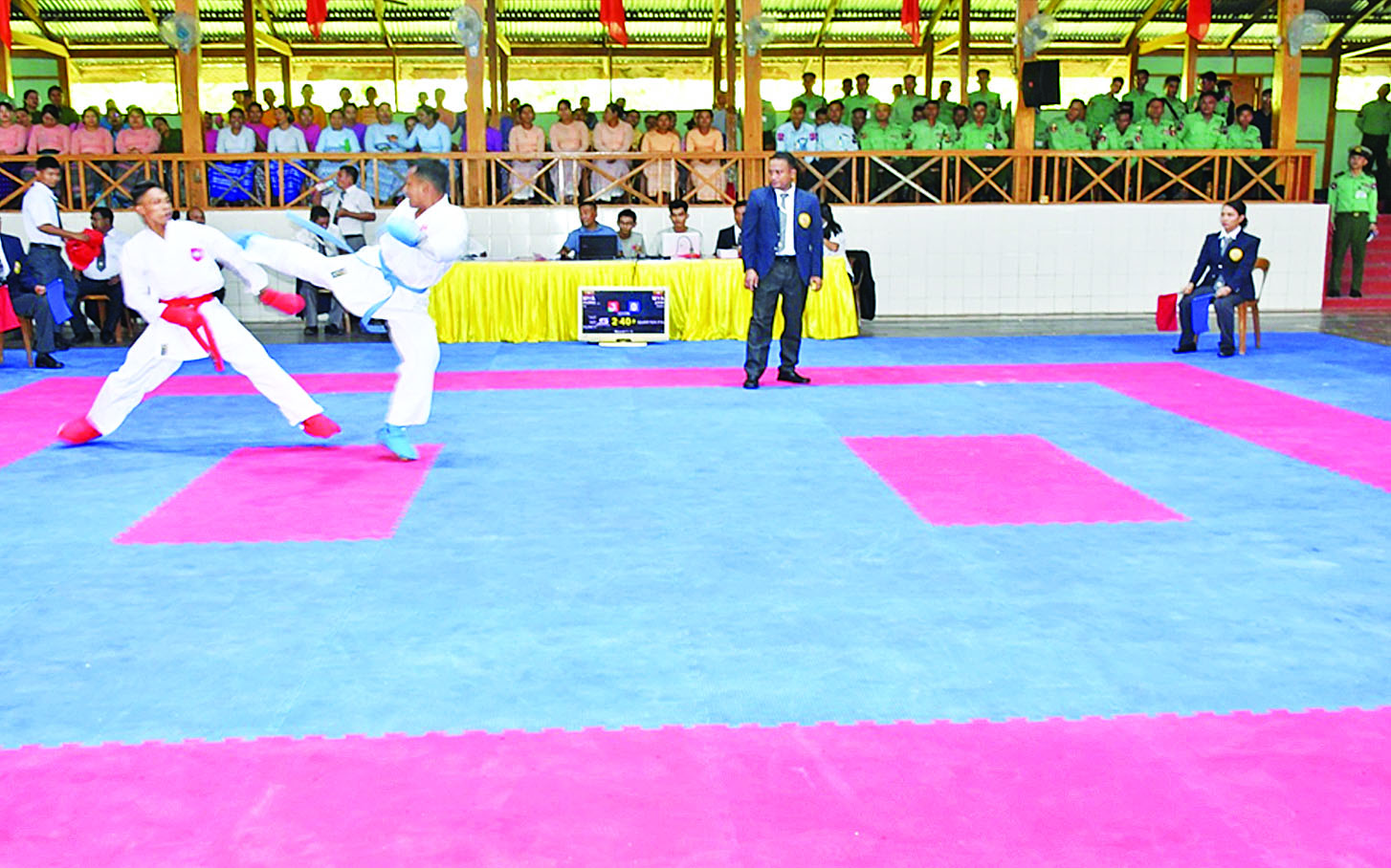 ၂၀၂၅ ခုနှစ် တပ်မတော်ကာကွယ် ရေးဦးစီးချုပ်ဒိုင်း၊ တပ်မတော်(ကြည်း၊ ရေ၊ လေ) ကရာတေး ပြိုင်ပွဲဖွင့်ပွဲကို ယနေ့မွန်းလွဲပိုင်းတွင် တောင်ပိုင်းတိုင်းစစ်ဌာနချုပ် အေးချမ်းဖြိုးခန်းမ၌ကျင်းပရာ တိုင်းမှူး ဗိုလ်ချုပ်ကြည်သိုက်နှင့် အဖွဲ့ဝင်များ၊ အရာရှိ၊ စစ်သည်၊ မိသားစုဝင်များ၊ ဒိုင်အဖွဲ့ဝင်များနှင့် ပြိုင်ပွဲဝင်အားကစားသမားများ တက်ရောက်ကြသည်။