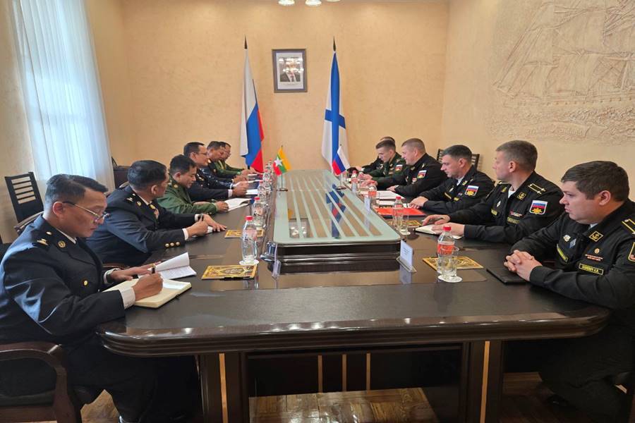 အလားတူ ကာကွယ်ရေးဦးစီးချုပ် (ရေ) ဦးဆောင်သော ကိုယ်စားလှယ်အဖွဲ့သည် အောက်တိုဘာ ၂၄ ရက်တွင် စိန့်ပီတာစဘတ်မြို့ရှိ ရုရှားရေတပ်ရုံးချုပ်သို့သွားရောက်ခဲ့ရာ ရုရှားရေတပ် ဦးစီးချုပ် ဗိုလ်ချုပ်ကြီး Aleksandr A.Moiseev နှင့် အဆင့်မြင့်အရာရှိကြီးများက ကြိုဆိုနှုတ်ဆက်ကြသည်။ ထို့နောက် ကာကွယ်ရေးဦးစီးချုပ် (ရေ) နှင့် ရုရှားရေတပ်ဦးစီးချုပ်တို့သည် ရုရှားရေတပ်ဂုဏ်ပြုတပ်ဖွဲ့ကို လိုက်လံကြည့်ရှုစစ်ဆေး၍ ဂုဏ်ပြုတပ်ဖွဲ့၏ အလေးပြုခြင်းကိုခံယူကြပြီး စုပေါင်း မှတ်တမ်းတင် ဓာတ်ပုံရိုက်ကူးကြသည်။ ထို့နောက် အစည်းအဝေးခန်းမ၌ နှစ်နိုင်ငံ ရေတပ်နှစ်ရပ်အကြား ပိုမိုပူးပေါင်းဆောင်ရွက်နိုင်မည့် ကိစ္စရပ်များနှင့် လေ့ကျင့်ရေးဆိုင်ရာကိစ္စရပ်များကို ရင်းနှီးပွင့်လင်းစွာ အမြင်ချင်းဖလှယ်ဆွေးနွေးကြပြီး ရုရှားရေတပ်ဦးစီးချုပ်ရုံးခန်း၊ အစည်းအဝေးခန်း၊ စာကြည့်တိုက်တို့ကို ကြည့်ရှုလေ့လာကြသည်။ ညပိုင်းတွင် ရုရှားရေတပ်ဦးစီးချုပ်က တည်ခင်းဧည့်ခံသော ဂုဏ်ပြုညစာစားပွဲသို့ တက်ရောက်ကြသည်။