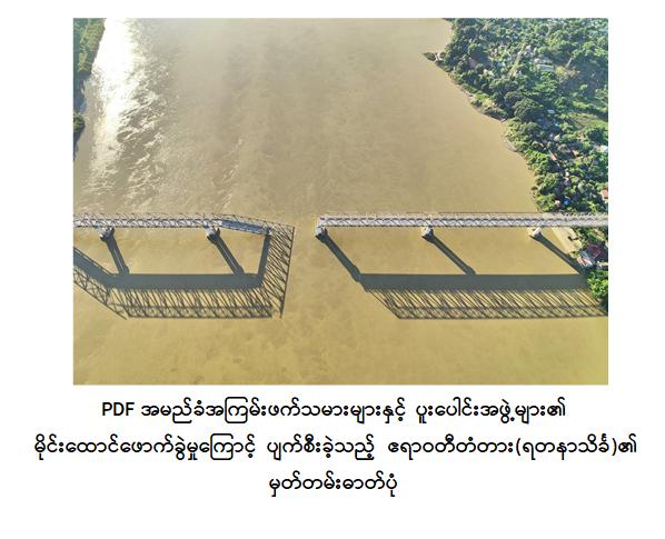 PDF အမည်ခံအကြမ်းဖက်သမားများနှင့် ပူးပေါင်းအဖွဲ့များသည် တိုင်းပြည်တည်ငြိမ်အေးချမ်းမှုပျက်ပြားစေရန်နှင့် ဒေသတွင်းကုန်စည်စီးဆင်းမှုများပျက်ပြားစေရန်ရည်ရွယ်၍ အများပြည်သူသွားလာအသုံးပြုလျက်ရှိသည့် လမ်း၊ တံတားများအား မိုင်းထောင်ဖောက်ခွဲဖျက်ဆီးခြင်းများကို ယုတ်မာရိုင်းစိုင်းစွာဥပဒေမဲ့ကျူးလွန်လျက်ရှိကြရာ ယနေ့တွင် ရွှေဘို-ကျောက်မြောင်း-စဉ့်ကူး-မန္တလေးသွားကားလမ်းပေါ်ရှိ ဧရာဝတီမြစ်ကူးတံတားတစ်စင်းဖြစ်သည့် ဧရာဝတီတံတား(ရတနာသိင်္ခ)အား အကြမ်းဖက်သမားများက ယုတ်မာရိုင်းစိုင်းစွာမိုင်းထောင်ဖောက်ခွဲဖျက်ဆီးခဲ့ကြောင်းသိရသည်။