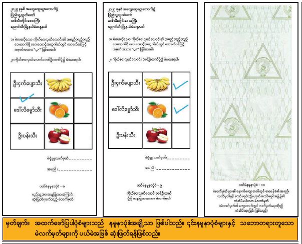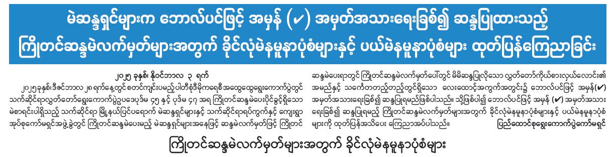 မဲဆန္ဒရှင်များက ဘောလ်ပင်ဖြင့် အမှန်အမှတ်အသားရေးခြစ်၍ ဆန္ဒပြုထားသည့် ကြိုတင်ဆန္ဒမဲ လက်မှတ်များ အတွက်ခိုင်လုံမဲနမူနာပုံစံများနှင့် ပယ်မဲနမူနာပုံစံများထုတ်ပြန်ကြေညာခြင်း 11/04/2025