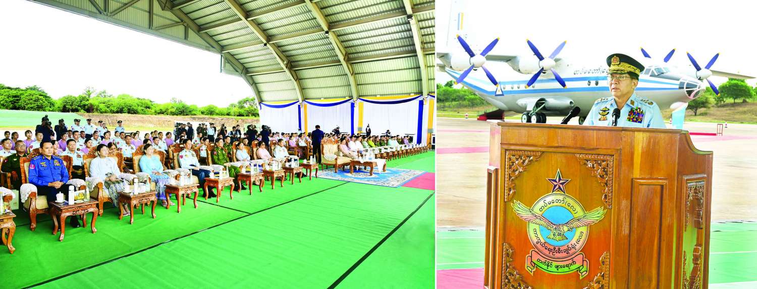 တပ်မတော် (လေ) ကို ၁၉၄၇ ခုနှစ် ဒီဇင်ဘာလ ၁၅ ရက်နေ့တွင် စတင်ဖွဲ့စည်းခဲ့ပြီး လာမည့်ဒီဇင်ဘာလဆိုပါက သက်တမ်း ၇၈ နှစ် ပြည့်မြောက်တော့မည်ဖြစ်ကြောင်း၊ အဆိုပါကာလအတွင်း၌ တပ်မတော်(လေ)သည် တပ်မတော်၏ အဓိကအစိတ်အပိုင်းတစ်ရပ်အနေဖြင့် ပေးအပ်လာသည့် တာဝန်အမျိုးမျိုးကို အစွမ်းကုန်ကျေပွန်ပြီးမြောက်အောင် ကြိုးပမ်းထမ်းဆောင်ခဲ့သည်ကို ဂုဏ်ယူဖွယ်တွေ့ရှိရကြောင်း၊ လက်ရှိတွင်လည်း တပ်မတော် (လေ) သည် မိမိတွင် ရရှိပိုင်ဆိုင်ထားသည့် လေကြောင်းစွမ်းအားအရင်းအမြစ်များကို အကျိုးအရှိဆုံး အသုံးချကာ ရည်မှန်းချက်တာဝန်များကို အောင်မြင်ထိရောက်စွာ ထမ်းဆောင်လျက်ရှိသည်ကို အသိအမှတ်ပြုပြောကြားလိုကြောင်း၊ ထိုသို့ထမ်းဆောင်နိုင်ခြင်းသည် တပ်မတော် (လေ) ၏ အဓိကမဏ္ဍိုင်ကြီး ၃ ရပ်ဖြစ်သည့် ပျံသန်းရေးကဏ္ဍမှ လေသူရဲနှင့် လေယာဉ်သားများ၊ စက်မှုလက်မှုကဏ္ဍမှ အင်ဂျင်နီယာနှင့် ကျွမ်းကျင်ပညာသည်များ၊ အုပ်ချုပ်ရေးကဏ္ဍမှ အုပ်ချုပ်ထောက်ပံ့မှုနှင့် ရုံး လုပ်ငန်းဆိုင်ရာ ပညာသည်များနှင့် စာရေးများ ဟန်ချက်ညီပူးပေါင်းလုပ်ဆောင်ခဲ့ကြခြင်းကြောင့်ဖြစ်ကြောင်း၊ လာမည့်အနာဂတ်တွင်လည်း ယနေ့တပ်တော်ဝင်ပေးမည့် လေယာဉ်/ ရဟတ်ယာဉ်များကို စနစ်တကျ ကျွမ်းကျင်ပိုင်နိုင်စွာ အသုံးချ၍ ဟန်ချက်ညီ ပူးပေါင်းကြိုးစားလုပ်ဆောင်ပြီး လုပ်ငန်းတာဝန်များကို ကျေပွန်အောင် ထမ်းဆောင်သွားကြရန် တိုက်တွန်းမှာကြားလိုကြောင်း။