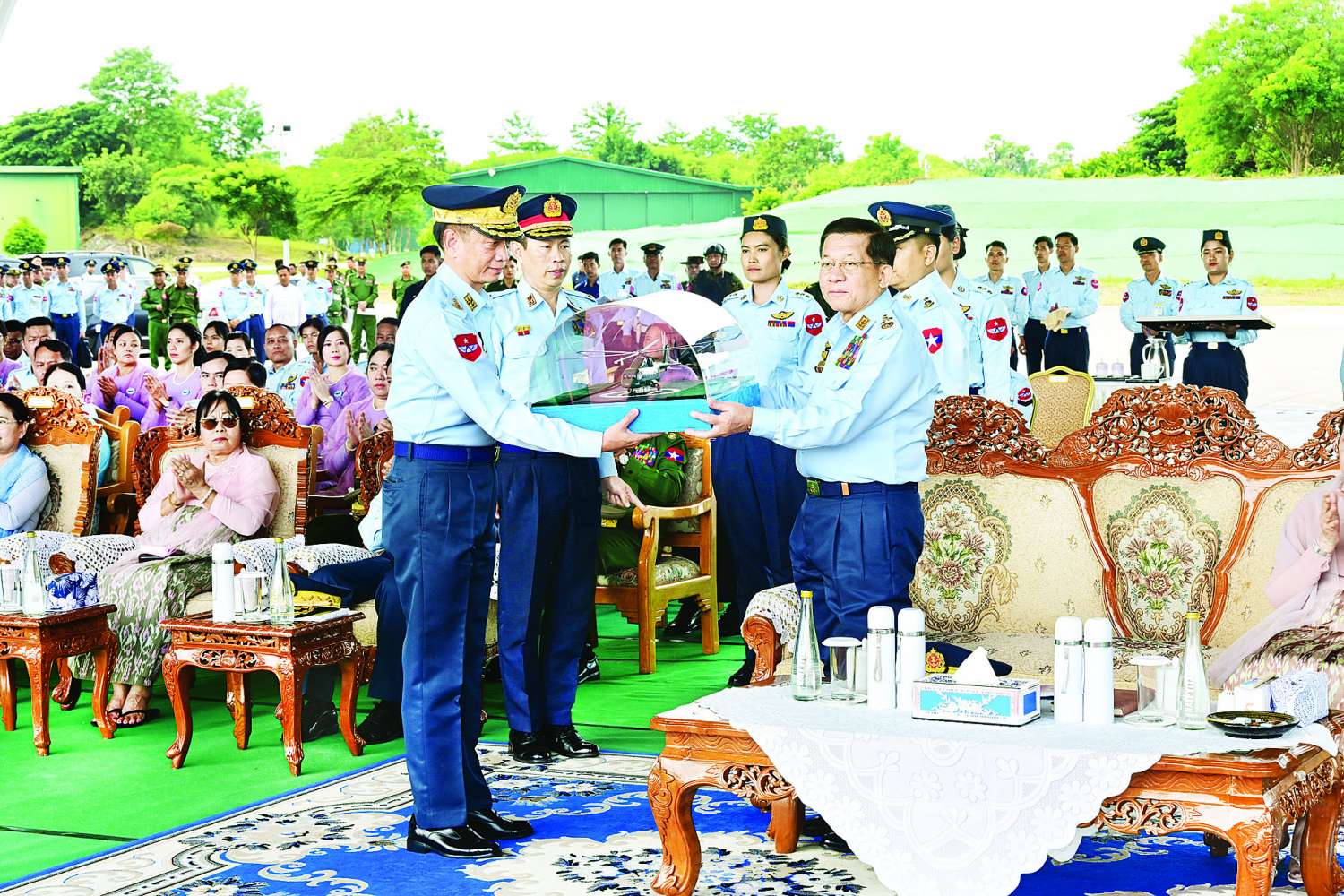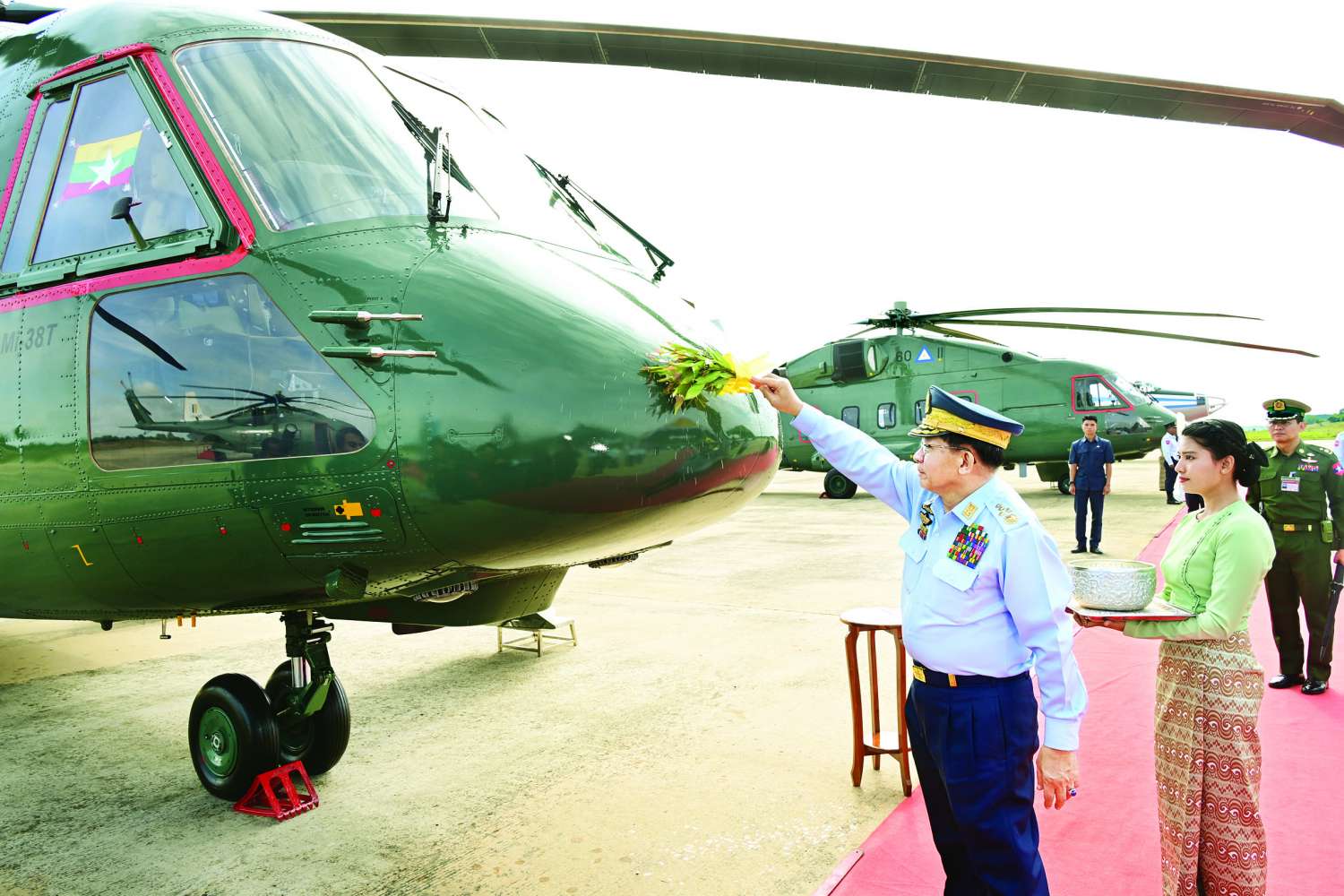 တပ်မတော် (လေ) မှ လေယာဉ်/ ရဟတ်ယာဉ်များ တပ်တော်ဝင်ခြင်းအခမ်းအနားကို ယနေ့နံနက်ပိုင်းတွင် နေပြည်တော်လေတပ်စခန်း၌ ကျင်းပပြုလုပ်ရာ နိုင်ငံတော်လုံခြုံရေးနှင့်အေးချမ်းသာယာရေးကော်မရှင်ဥက္ကဋ္ဌ တပ်မတော်ကာကွယ်ရေးဦးစီးချုပ် ဗိုလ်ချုပ်မှူးကြီး မင်းအောင်လှိုင် တက်ရောက်ချီးမြှင့်သည်။