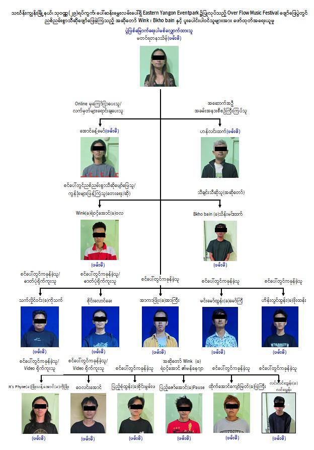 ထိုသို့ အများပြည်သူအား စိုးရိမ်ထိတ်လန့်မှုဖြစ်ပေါ်စေပြီး ညစ်ညမ်းသောစကားများပြောဆိုကာ “ကွန်ဒုံးများ" ဖြန့်ဝေပြီး သီဆိုကခုန်ခဲ့ကြသူများဖြစ်ကြသည့် အဆိုတော် Wink (ခ) ရဲဝင့်အောင် (ခ) ဗလနှင့် Bkho Bain (ခ) သိန်းမင်းထက်တို့ပါ အမျိုးသား ၁၃ ဦးနှင့် ပွဲစီစဉ်သူများဖြစ်ကြသည့် တင်ရတနာသိမ့်၊ ဟန်လင်းထက်နှင့် အောင်ခန့်မော်(ခ) ဂျပန်ကြီးတို့အား သ င်္ဃန်းကျွန်းမြို့နယ်၊ သုဝဏ္ဏနယ်မြေရဲစခန်း၌ (ပ)၂၁၃/၂၀၂၅၊ ရာဇသတ်ကြီး ပုဒ်မ-၅၀၅-က/ ၂၉၄/၁၁၄ အရ အမှုရေးဖွင့်ထားရှိကြောင်းနှင့် ၎င်းတို့အားဥပဒေနှင့်အညီ ထိရောက်စွာ အပြစ်ပေးအရေးယူနိုင်ရေး ဆက်လက်ဆောင်ရွက်လျက်ရှိကြောင်း သတင်းရရှိပါသည်။