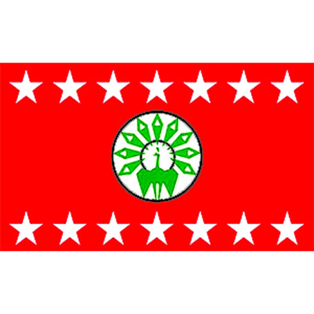 အောက်ခံအရောင်အနီ၊ အလယ်တွင် အဖြူရောင်အောက်ခံအဝိုင်းအတွင်း အစိမ်းရောင်ကဒေါင်းနှင့် ကဒေါင်း၏ အောက်နှင့် အထက်တို့တွင် အရွယ်တူကြယ်ဖြူ (၇) လုံးစီကို အတန်းလိုက် ဖော်ကျူးထားပါတယ်။ အဲဒီအလံကို ပါတီအထိမ်းအမှတ်အလံအဖြစ် သတ်မှတ်ပါတယ်။