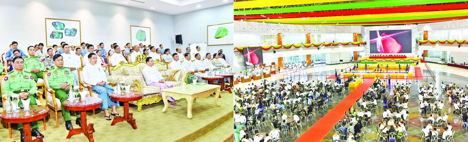 (၆၀)ကြိမ်မြောက် မြန်မာ့ကျောက်မျက်ရတနာပြပွဲ ဖွင့်ပွဲအခမ်းအနားကို ယနေ့နံနက်ပိုင်းတွင် နေပြည်တော်ရှိ မဏိရတနာကျောက်စိမ်းခန်းမ၌ကျင်းပရာ ပြည်ထောင်စုသမ္မတမြန်မာနိုင်ငံတော် ယာယီမ္မတ နိုင်ငံတော်လုံခြုံရေးနှင့် အေးချမ်းသာယာရေးကော်မရှင်ဥက္ကဋ္ဌ ဗိုလ်ချုပ်မှူးကြီးမင်းအောင်လှိုင် တက်ရောက်ချီးမြှင့်သည်။