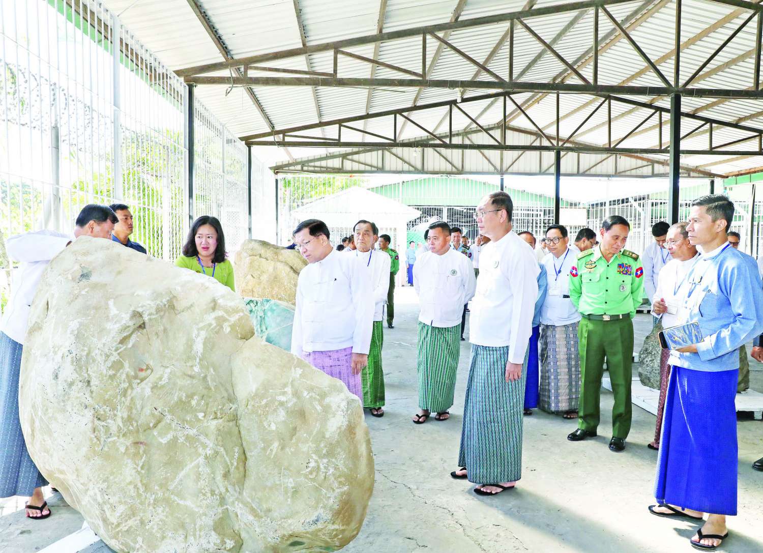 ထို့နောက် နိုင်ငံတော်ယာယီသမ္မတ နိုင်ငံတော်လုံခြုံရေးနှင့်အေးချမ်းသာယာရေးကော်မရှင်ဥက္ကဋ္ဌနှင့် အဖွဲ့ဝင်များသည် ပုဂ္ဂလိကကျောက်မျက်ရတနာ အချောထည်အရောင်းပြခန်းများ ဖွင့်လှစ်ရောင်းချနေမှုကို လိုက်လံကြည့်ရှုအားပေးပြီး ခန်းမအပြင်ဘက်တွင် ခင်းကျင်းပြသထားသည့် ကျောက်စိမ်းရိုင်းအတွဲများကို လိုက်လံကြည့်ရှုစစ်ဆေးသည်။
