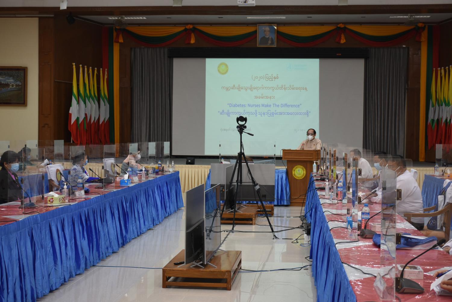 အခမ်းအနားတွင် ပြည်ထောင်စုဝန်ကြီး ဒေါက်တာမြင့်ထွေး က ကျန်းမာရေးနှင့်အားကစား ဝန်ကြီးဌာနအနေဖြင့် ကိုဗစ်-၁၉ ကာကွယ်ထိန်းချုပ်ရေးလုပ်ငန်းများကို ကြိုးပမ်းအားထုတ်ဆောင်ရွက် နေသကဲ့သို့ အခြားသော ကျန်းမာရေးပြဿနာများ၊ ရောဂါများ ကာကွယ်၊ ထိန်းချုပ်၊ ကုသခြင်း လုပ်ငန်းများကိုလည်း လစ်ဟာမှုမရှိစေရေး ဆောင်ရွက်လျက် ရှိပါကြောင်း၊ ကမ္ဘာ့ကျန်းမာရေးအဖွဲ့၏ အချက်အလက်များအရ (၂၀၂၀) ပြည့်နှစ်တွင် ကမ္ဘာတစ်ဝန်း၌ ဆီးချိုသွေးချိုရောဂါဖြစ်ပွားသူပေါင်း (၄၆၃) သန်းကျော်ရှိနေပြီး နှစ်စဉ်ရောဂါနှင့် ဆက်စပ်သေဆုံးသူပေါင်း (၄ ဒသမ ၂) သန်းကျော် ရှိပါကြောင်း၊(၂၀၁၄) ခုနှစ်က မြန်မာနိုင်ငံတွင်ပြုလုပ်ခဲ့သော WHO STEPS Survey အစီရင်ခံစာအရ အသက် (၁၅) နှစ်မှ (၆၄) နှစ် အရွယ်အတွင်း ဆီးချိုသွေးချိုရောဂါဖြစ်ပွားသူသည် (၁၀ ဒသမ ၅) ရာခိုင်နှုန်းရှိနေပြီး ရောဂါနှင့် ဆက်စပ် သေဆုံးသူပေါင်း (၁၉ ဒသမ ၇) ရာခိုင်နှုန်းရှိပါကြောင်း၊ ယခုအခါတွင် ဆီးချိုသွေးချိုရောဂါ အပါအဝင် မကူးစက်နိုင်သောရောဂါများသည် နေထိုင်မှုပုံစံများ၊ စားသောက်မှုပုံစံများ ပြောင်းလဲမှုကြောင့် ဖြစ်ပွားမှု ပိုမိုများပြားလာလျက်ရှိပါကြောင်း၊ ထိုသို့အရေးကြီး သည့် ကျန်းမာရေး ပြဿနာဖြစ်သည့်အတွက် ကမ္ဘာ့ ကျန်းမာရေးညီလာခံတွင် သဘောတူညီဆုံးဖြတ်ချက် များအရ (၂၀၀၆) ခုနှစ်မှ စတင်၍ နှစ်စဉ် နိုဝင်ဘာလ (၁၄) ရက်နေ့ကို ကမ္ဘာ့ဆီးချိုသွေးချို ရောဂါကာကွယ် ထိန်းသိမ်းရေးနေ့ (World Diabetes Day) အဖြစ် သတ်မှတ် ပြုလုပ်ခြင်းဖြစ်ပါကြောင်း။