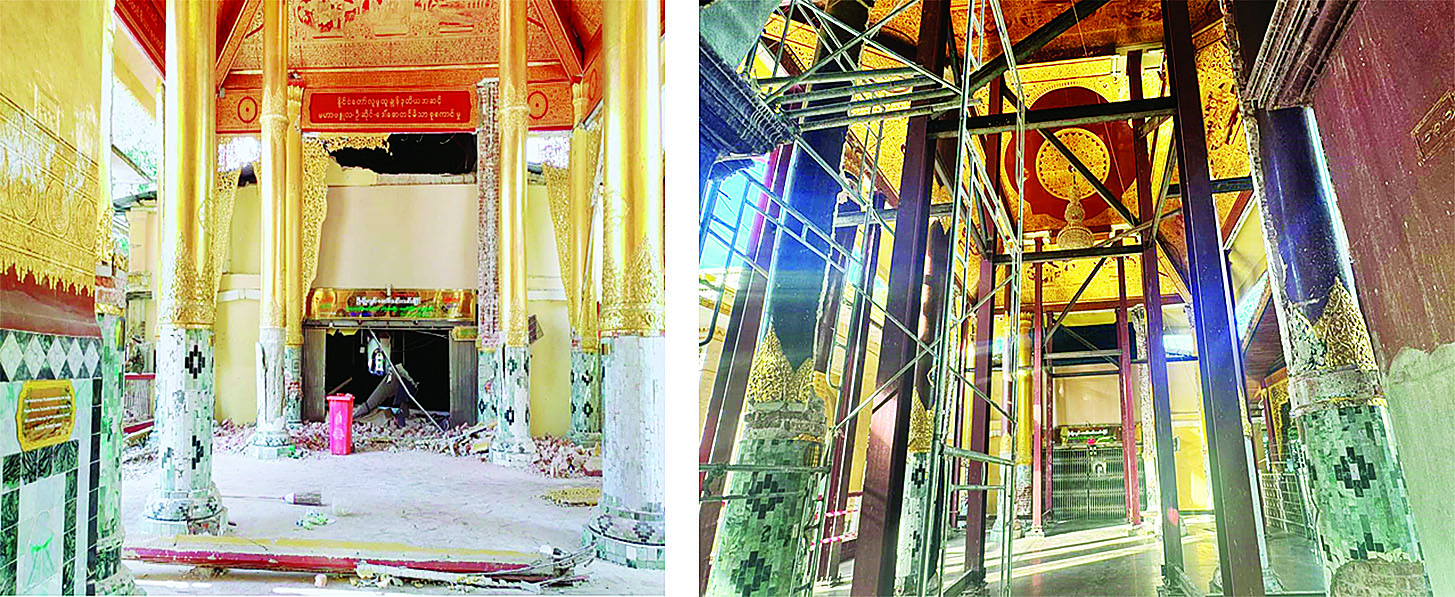 ယင်းနောက် နိုင်ငံတော်ယာယီသမ္မတ နိုင်ငံတော်လုံခြုံရေးနှင့်အေးချမ်းသာယာရေးကော်မရှင်ဥက္ကဋ္ဌနှင့် အဖွဲ့ဝင်များသည် ပြည်ပလှူဖွယ်ပစ္စည်းများပြခန်းနှင့် ချိတ်ဆွဲရတနာခန်းမသို့ ရောက်ရှိပြီး ငလျင်ဘေးဒဏ်ဖြစ်ပေါ်ချိန်တွင် ပြင်းထန်သော လှုပ်ခတ်မှုများကြောင့် မြေခခဲ့ရသည့် စိန်ဖူးတော်၊ ငှက်မြတ်နားတော်တို့၌ စေတနာရှင် အများပြည်သူများ လှူဒါန်းထားရှိသည့် ရတနာရွှေငွေကျောက်သံပတ္တမြားနှင့် စိန်ဖူးတော်များ၊ ငှက်မြတ်နားတော်၊ ရတနာရွှေအိုးနှင့် ဆည်းလည်းကိုးခိုင်၊ နတ်မင်းကြီးလေးပါး၊ ဇွန်းလေးဘုံ၊ ဆပ်သွားဖူးတော်၊ ထီးတော်ကြီး ဘုံကိုးဆင့်တို့အား ထိန်းသိမ်းထားရှိမှုအခြေအနေများကို ကြည့်ရှုစစ်ဆေးပြီးတာဝန်ရှိသူများ၏ တင်ပြချက်များအပေါ် လိုအပ်သည်များ လမ်းညွှန်မှာကြားသည်။