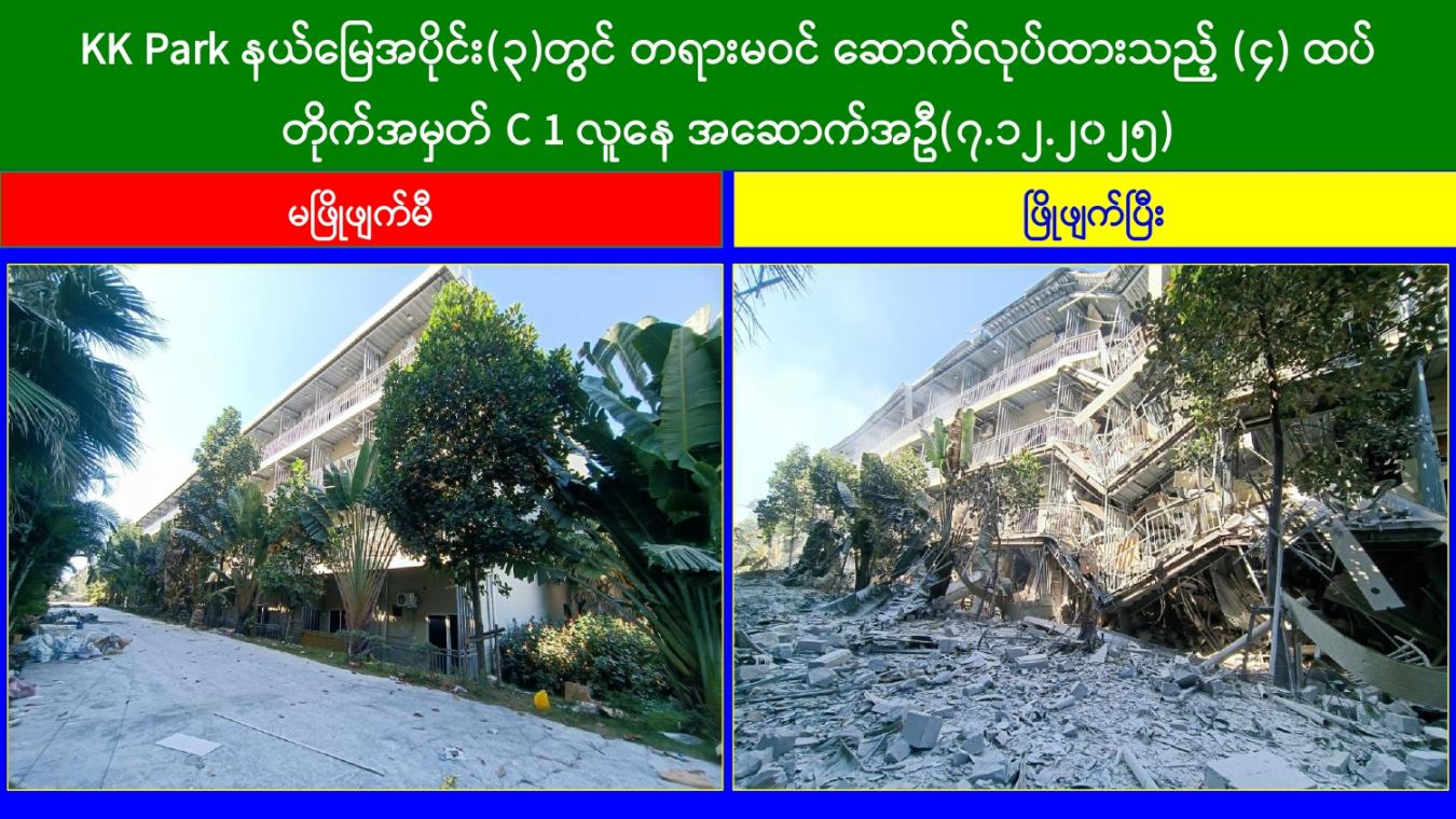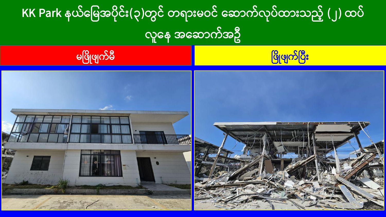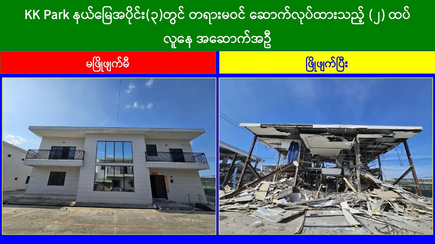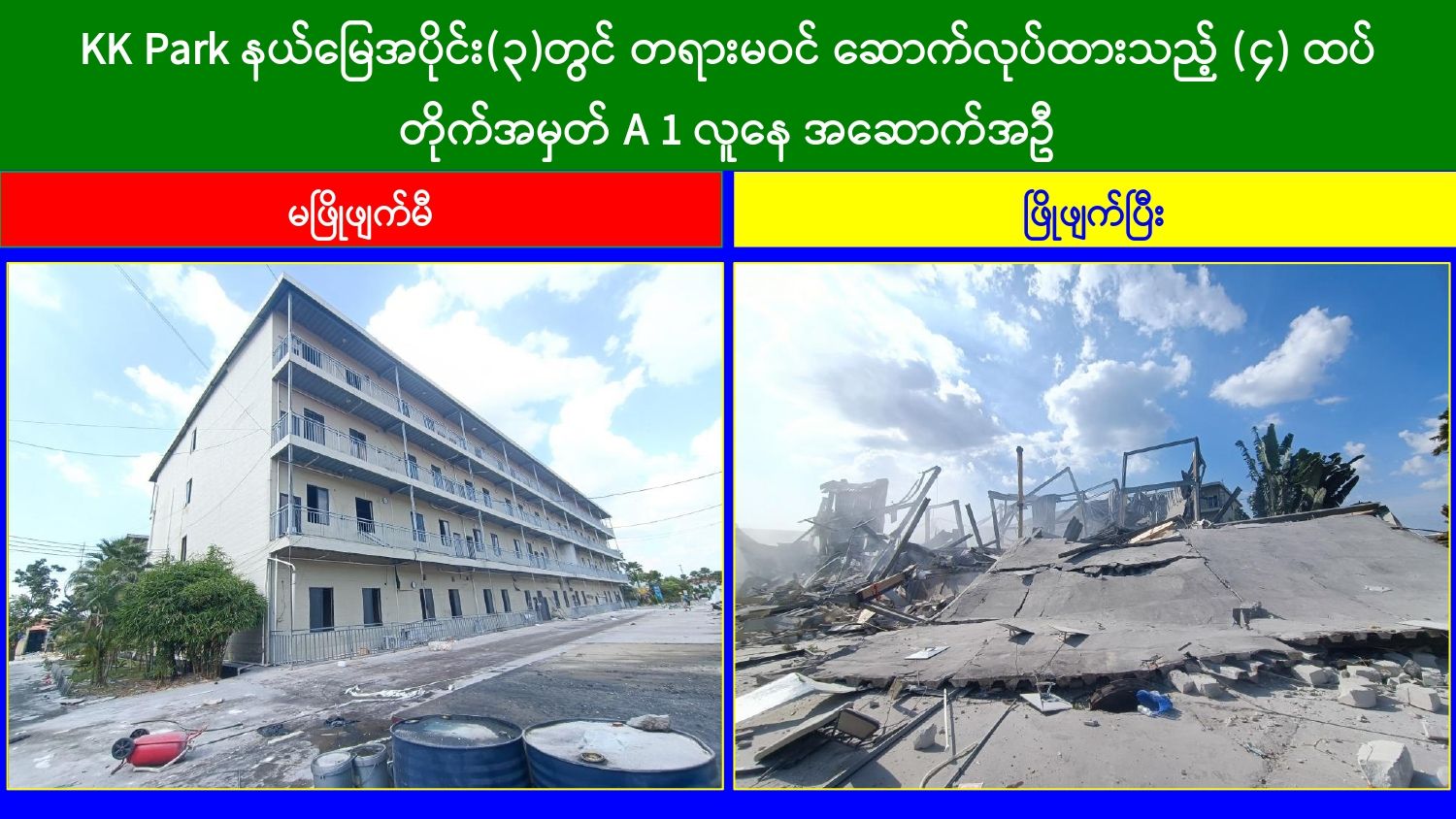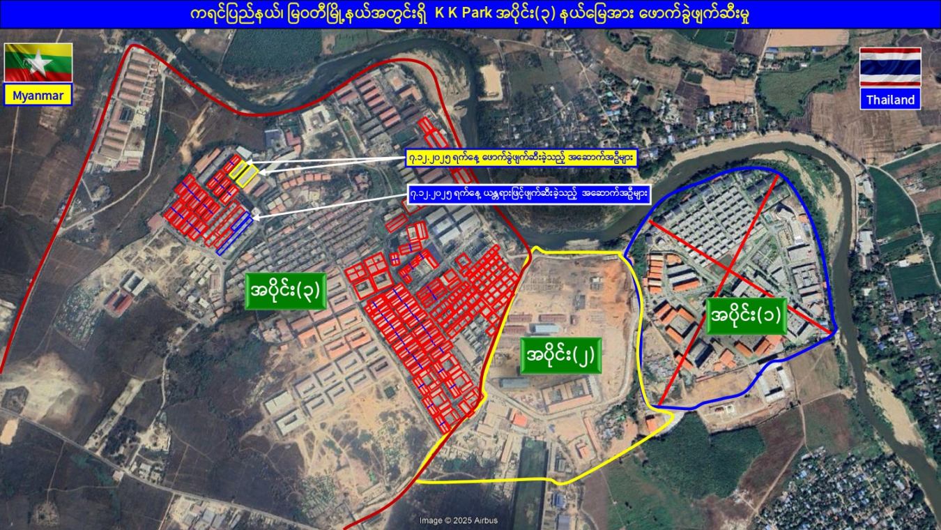 ထိုသို့ အွန်လိုင်းလိမ်လည်လောင်းကစားမှုတိုက်ဖျက်ရေး လုပ်ငန်းများဆောင်ရွက်လျက်ရှိရာ ယနေ့တွင် မြဝတီ-မဲ့ထော်သလေး (KK Park) နယ်မြေအတွင်းရှိ အွန်လိုင်းလိမ်လည်လောင်းကစားမှုများ ကျူးလွန်ရာတွင် အသုံးပြုခဲ့သည့် အပိုင်း(၃) နယ်မြေအတွင်းရှိ တရားမဝင် ၄ ထပ်အဆောက်အအုံ ၂ လုံးနှင့် ၂ ထပ်အဆောက်အအုံ ၁၀ လုံး၊ စုစုပေါင်း တရားမဝင်အဆောက်အအုံ ၁၂ လုံးကို ထပ်မံဖြိုချဖျက်ဆီးခဲ့သဖြင့် KK Park နယ်မြေအတွင်းရှိ တရားမဝင်အဆောက်အအုံ စုစုပေါင်း ၆၃၅ လုံး အနက် ၃၃၃ လုံးကို စနစ်တကျ ဖြိုချဖျက်ဆီးပြီးဖြစ်ကြောင်း သိရှိရသည်။