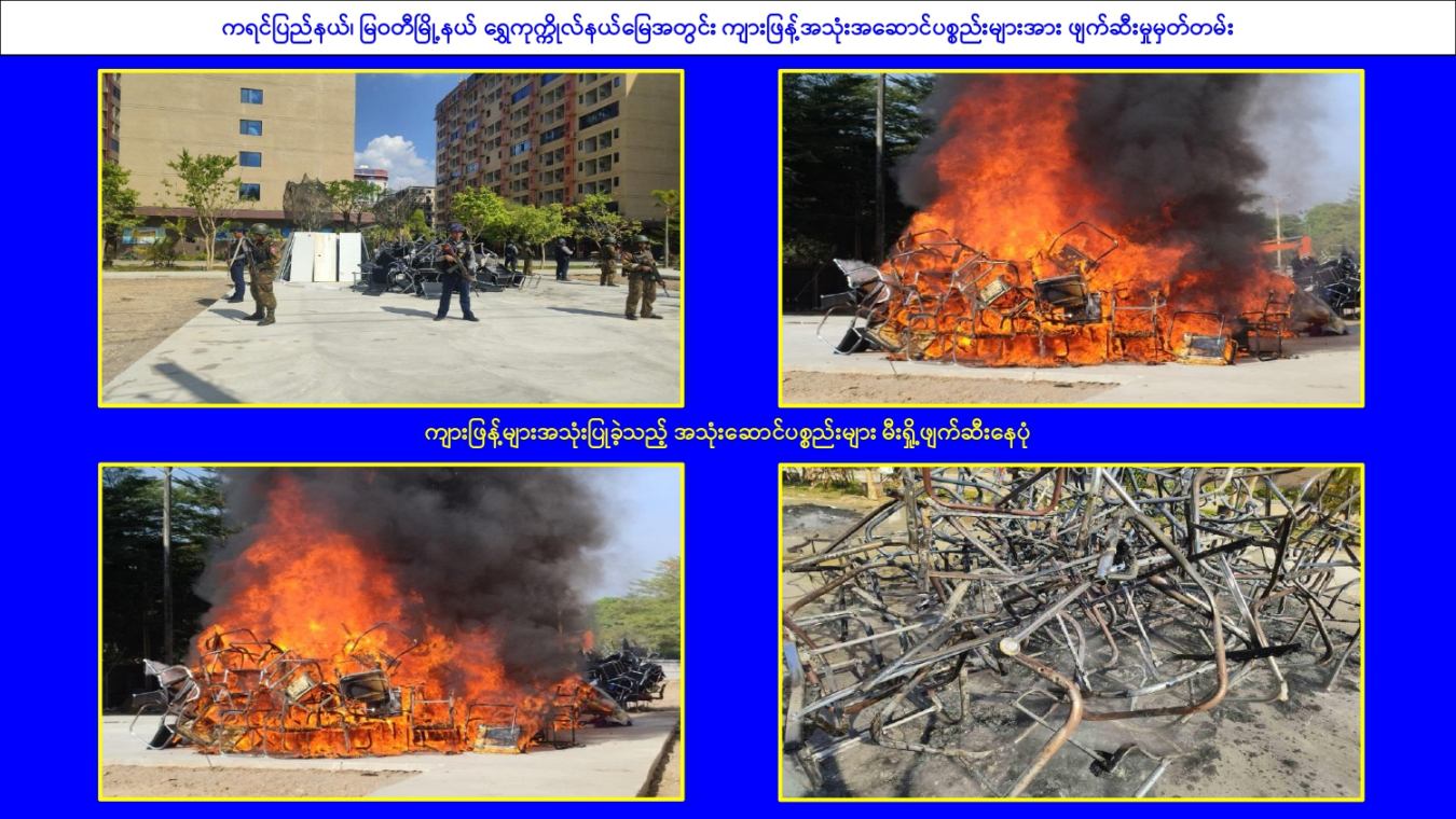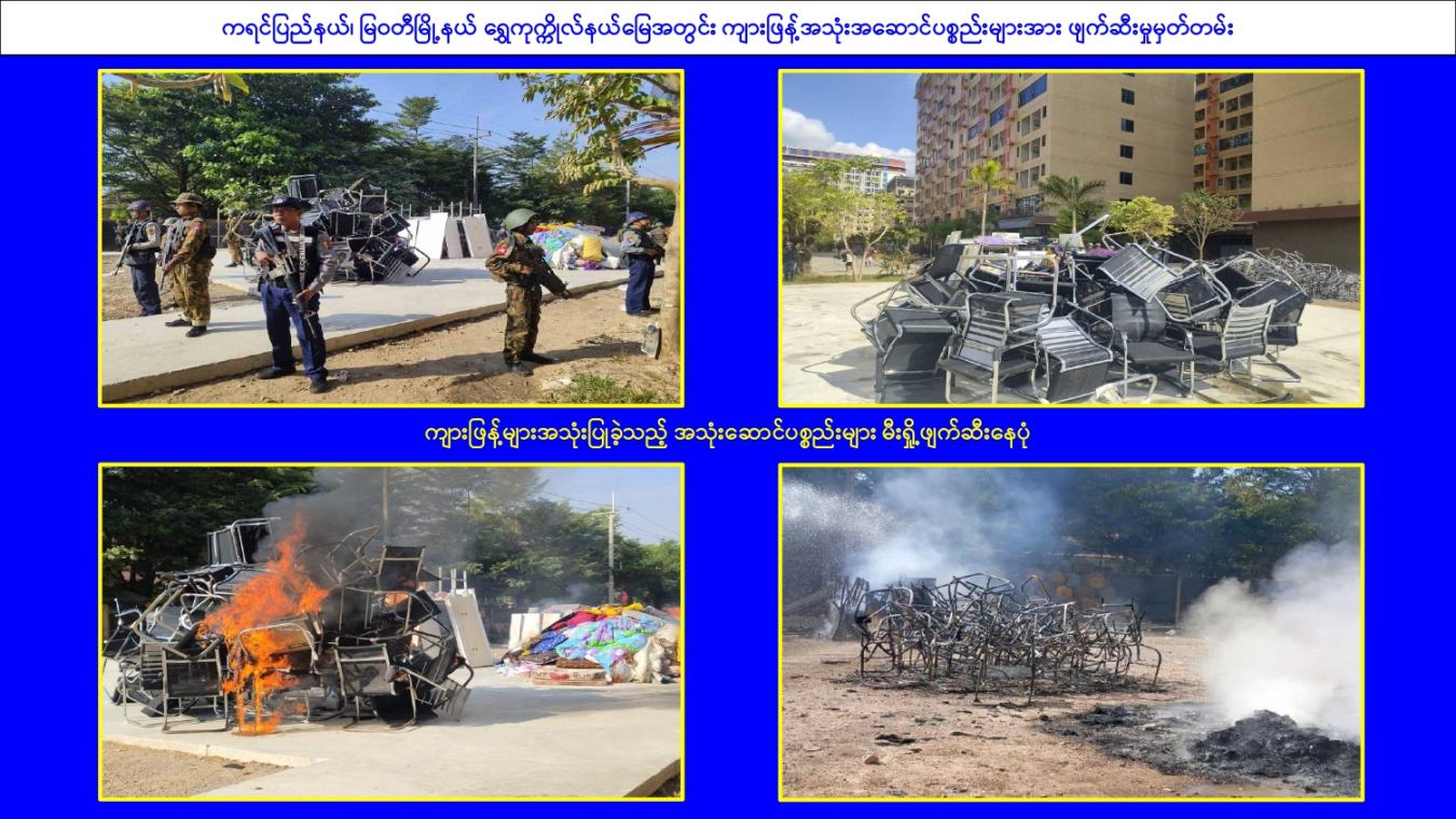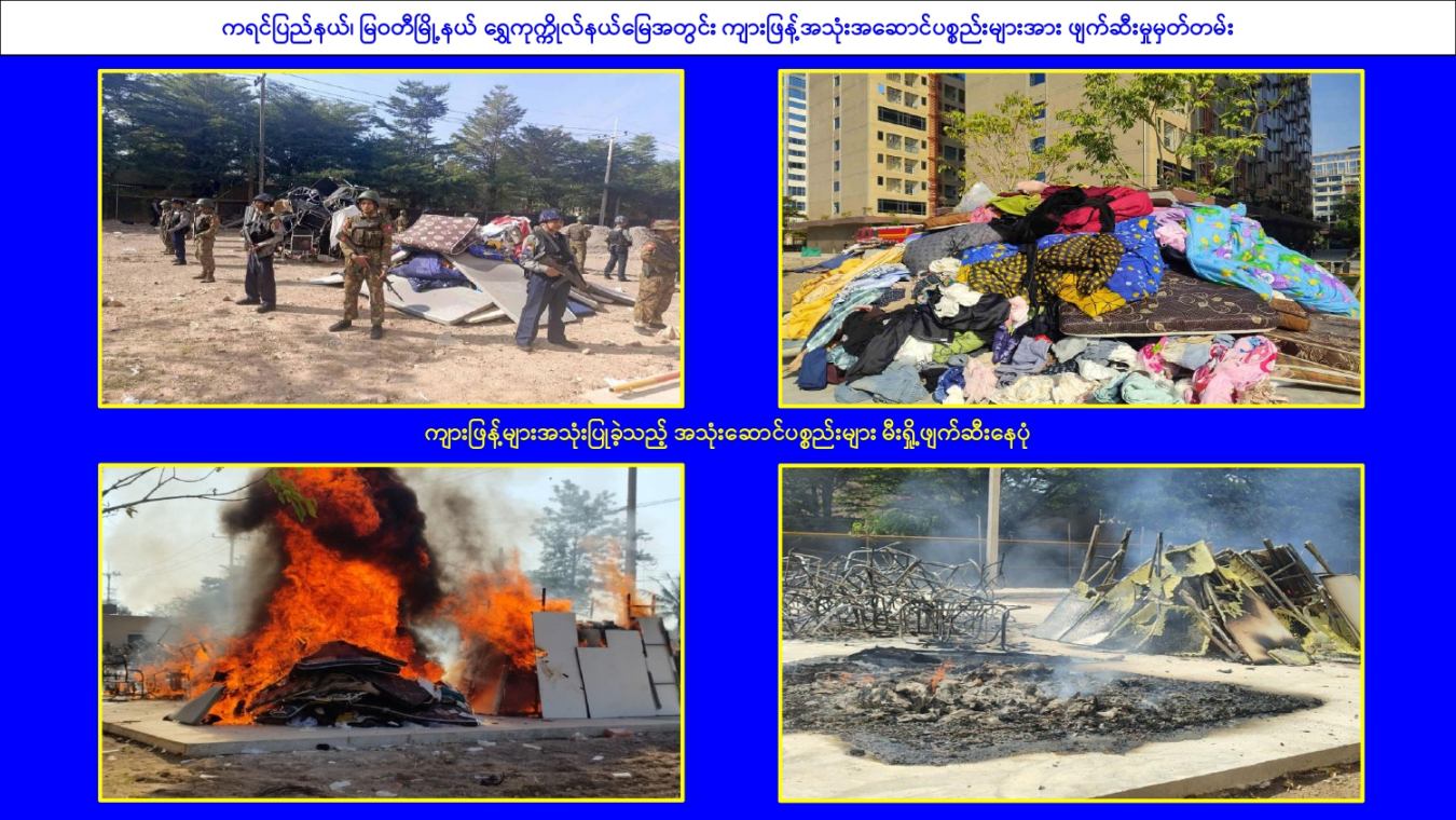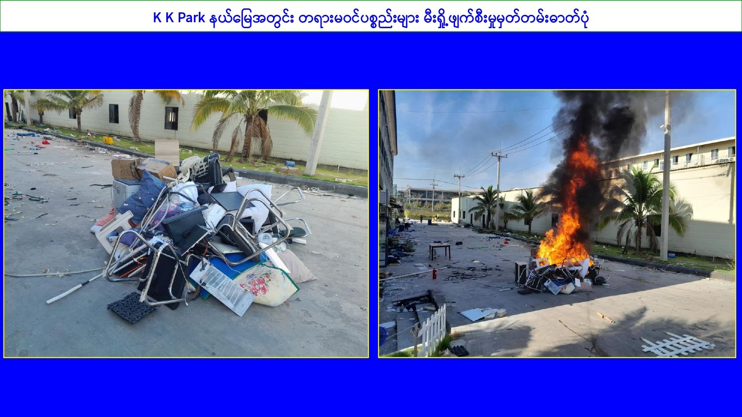ထို့ပြင် KK park နယ်မြေနှင့် ရွှေကုက္ကိုလ်နယ်မြေတို့ရှိ အွန်လိုင်းလိမ်လည်လောင်း ကစားမှုကျူးလွန်ရာတွင်အသုံးပြုခဲ့သည့် ပစ္စည်းများအား ထပ်မံအသုံးပြုမှုမရှိစေရေးအတွက် ယနေ့တွင်လည်း စနစ်တကျမီးရှို့ဖျက်ဆီးခဲ့ကြောင်း၊ အဆိုပါ နယ်မြေများရှိ ဖမ်းဆီးထိန်းသိမ်းထားရှိသည့် တရားမဝင်ပြည်ပနိုင်ငံသားများကို တရားမဝင်ပြည်ပနိုင်ငံသား စစ်ဆေးရေးအဖွဲ့က စစ်ဆေး၍ သက်ဆိုင်ရာနိုင်ငံများသို့ အမြန်ဆုံးပြန်လည်လွှဲပြောင်းပေးနိုင်ရေးအတွက် ဌာနဆိုင်ရာပူးပေါင်းအဖွဲ့များဖြင့် လိုအပ်သည့် ကိုယ်ရေးအချက်အလက်များနှင့် မှတ်တမ်းများ စာရင်းကောက်ယူခြင်းလုပ်ငန်းများ ဆောင်ရွက်ပေးလျက်ရှိကြောင်း သိရှိရသည်။