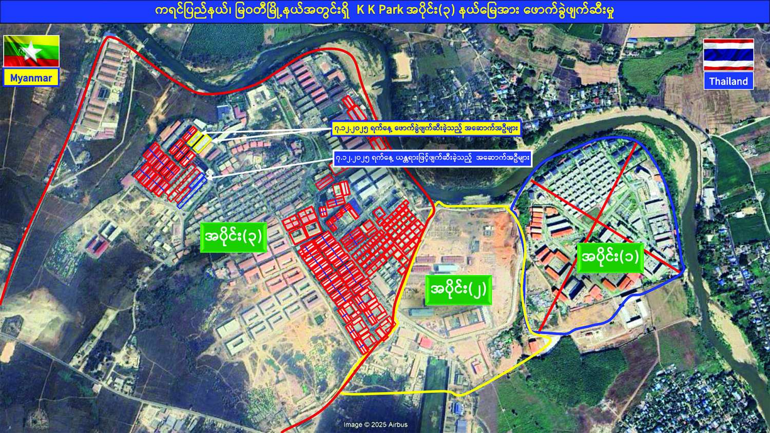 ထိုသို့ အွန်လိုင်းလိမ်လည်လောင်းကစားမှုတိုက်ဖျက်ရေး လုပ်ငန်းများဆောင်ရွက်လျက်ရှိရာ ယနေ့တွင် မြဝတီ-မဲ့ထော်သလေး (KK Park) နယ်မြေအတွင်းရှိ အွန်လိုင်းလိမ်လည်လောင်းကစားမှုများ ကျူးလွန်ရာတွင် အသုံးပြုခဲ့သည့် အပိုင်း(၃) နယ်မြေအတွင်းရှိ တရားမဝင် ၄ ထပ်အဆောက်အအုံ ၂ လုံးနှင့် ၂ ထပ်အဆောက်အအုံ ၁၀ လုံး၊ စုစုပေါင်း တရားမဝင်အဆောက်အအုံ ၁၂ လုံးကို ထပ်မံဖြိုချဖျက်ဆီးခဲ့သဖြင့် KK Park နယ်မြေအတွင်းရှိ တရားမဝင်အဆောက်အအုံ စုစုပေါင်း ၆၃၅ လုံး အနက် ၃၃၃ လုံးကို စနစ်တကျ ဖြိုချဖျက်ဆီးပြီးဖြစ်ကြောင်း သိရှိရသည်။