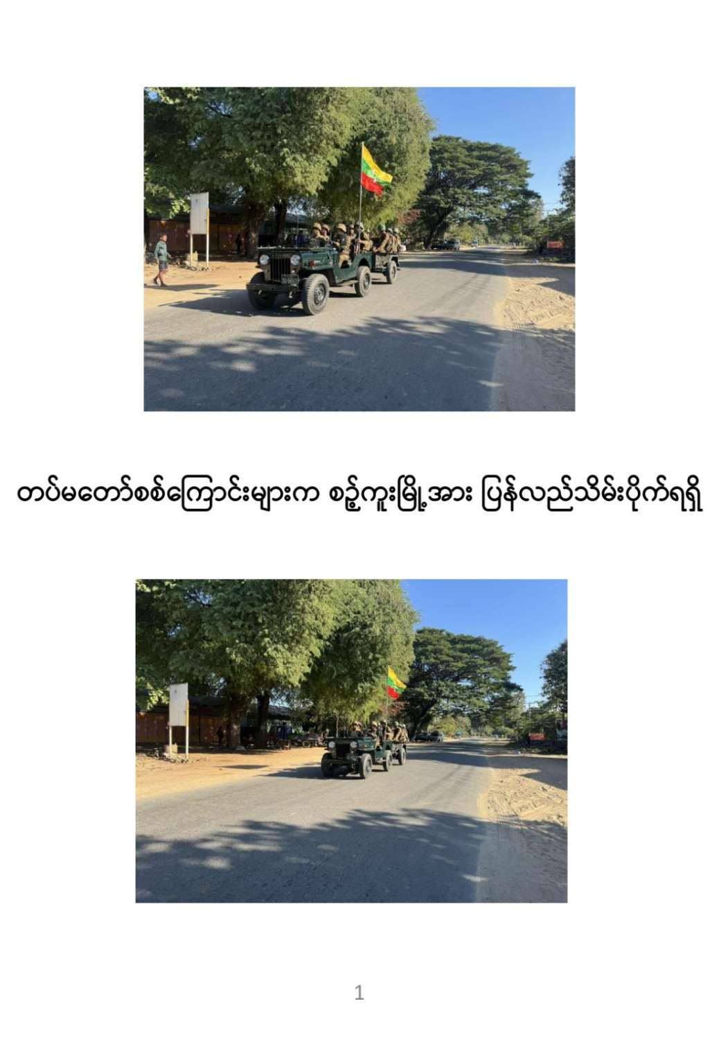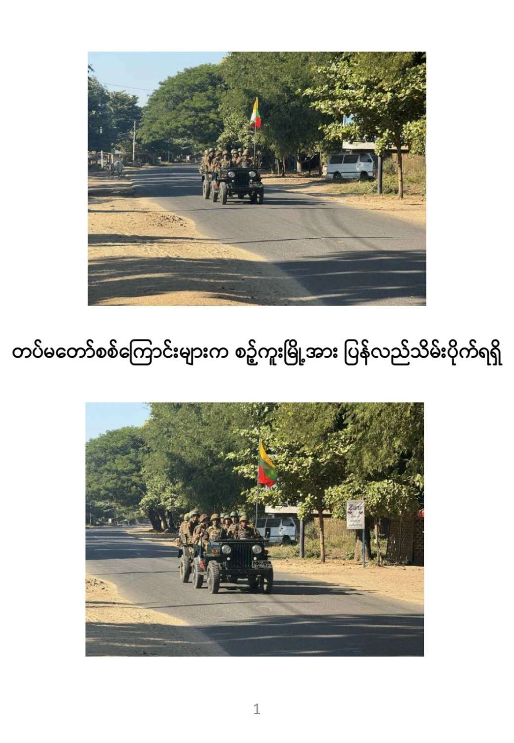 ယခု ဆုတ်ခွာထွက်ပြေးစဉ်တွင်လည်း ၎င်းတို့လုပ်ဆောင်နေကျနည်းလမ်းများဖြစ်သည့် ပြည်သူများပိုင်ဆိုင်သည့် အဖိုးတန်နှင့် အမြတ်တနိုးသိမ်းဆည်းထားသော ပစ္စည်းများအား အတင်းအဓမ္မယူဆောင်ခြင်း၊ အဆိုပါဒေသအတွင်းရှိ နိုင်ငံတော်၏ သယံဇာတဖြစ်သော တရားဝင်ခွင့်ပြုထားသည့် ရွှေလုပ်ကွက်များအတွင်း အတင်းအဓမ္မဝင်ရောက်လုပ်ကိုင်တူးဖော်ခြင်း၊ ပြည်သူများပိုင်ဆိုင်သည့် အဖိုးတန်ပစ္စည်းများကို လက်နက်အားကိုးဖြင့် အနိုင်ကျင့်ယူဆောင်ခြင်းများ ပြုလုပ်ကာ ရွှေ/သတ္တု ရောရာ မြေစာများနှင့် အဖိုးတန်ပစ္စည်းများအား ယာယီနေရပ်စွန့်ခွာ ပြည်သူများထားရှိခဲ့သည့် မော်တော်ယာဉ်များဖြင့် တင်ဆောင်ကာ ဧရာဝတီမြစ်အားဖြတ်ကူး၍ ဆုတ်ခွာထွက်ပြေးရန် လုပ်ဆောင်လျက်ရှိကြောင်း မြေပြင်သတင်းဖော်ထုတ်ချက်အရ တပ်မတော်စစ်ကြောင်းများက မြေပြင်၊ ဝေဟင်စစ်နည်းဗျူဟာမြောက် ပေါင်းစပ်ချေမှုန်းခဲ့ရာ အကြမ်းဖက်သောင်းကျန်းသူများသည် အထိနာစွာဖြင့် ဧရာဝတီမြစ်အနောက်ဘက်သို့ ဆုတ်ခွာထွက်ပြေးစဉ် အစီအစဉ်ပျက်ပြားကာ ဦးတည်ရာမဲ့ထွက်ပြေးလျက်ရှိပြီး အဆိုပါအကြမ်းဖက်သောင်းကျန်းသူများကိုလည်း တပ်မတော်စစ်ကြောင်းများက မြေပြင်/ဝေဟင်ပေါင်းစပ်၍ ထပ်ချပ်လိုက်လံချေမှုန်းလျက်ရှိကြောင်းနှင့် စဉ့်ကူးမြို့နှင့် လက်ပန်လှကျေးရွာအတွင်း ယာယီနေရပ်စွန့်ခွာပြည်သူများ အန္တရာယ်ကင်းရှင်းစွာ ပြန်လည်ဝင်ရောက်နေထိုင်နိုင်ရေးနှင့် အစိုးရအုပ်ချုပ်မှုယန္တရား အမြန်ဆုံးပြန်လည်လည်ပတ်နိုင်ရေးအတွက် လိုအပ်သည့် နယ်မြေလုံခြုံရေးလုပ်ငန်းများ တိုးမြှင့်ဆောင်ရွက်လျက်ရှိကြောင်း သတင်းရရှိသည်။