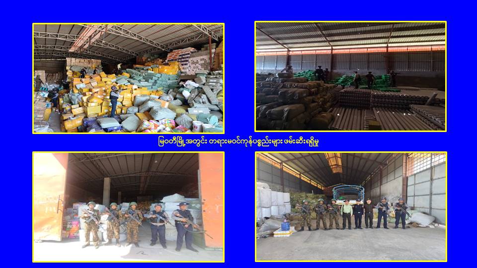 ထို့ပြင် မြဝတီမြို့အတွင်း၌လည်း တရားမဝင် ဝင်ရောက်နေထိုင်သူများနှင့် အွန်လိုင်းလောင်းကစားကျူးလွန်သူများအား ဖမ်းဆီးရမိရေးလုံခြုံရေးပူးပေါင်းအဖွဲ့များက သတင်းအရ မြဝတီမြို့ဝန်းကျင်တွင် ရှောင်တခင်စစ်ဆေးခြင်းများ၊ မြဝတီမြို့အဝင်/အထွက် လမ်းကြောင်းနေရာများနှင့် လမ်းဆုံလမ်းခွနေရာများတွင် ပိတ်ဆို့စစ်ဆေးရှာဖွေရှင်းလင်းခြင်းများ ဆောင်ရွက်ခဲ့ရာ ယနေ့တွင်လည်း တရားမဝင်အဆောက်အအုံ ၅ လုံးအား ထပ်မံစစ်ဆေးနိုင်ခဲ့ပြီး အဆိုပါအဆောက်အုံများအနက်မှ မြဝတီမြို့၊ မြေနီကုန်းရပ်ကွက်အနီး လူမနေပိတ်ထားသည့် တည်းခိုခန်းအတွင်း၌ တရားမဝင်တရုတ်နိုင်ငံသား အမျိုးသား ၁၅ ဦးအားလည်းကောင်း၊ ဂိုထောင် ၂ လုံးအတွင်း၌ တရားမဝင်ကုန်ပစ္စည်းများဖြစ်သော ကားကြီးတာယာ (ဆိုဒ် TX ၆၀) ၂၀၀ လုံး၊ မိုးကာလိပ်အစိမ်း ၃၀၀၀ လိပ်၊ စက္ကူလိပ် (အကြီး) ၂၀ လိပ်၊ Air Fiter ဘူး (အကြီး) ၂၀ လုံး၊ Air Fiter ဘူး (အသေး) ၃၀ လုံး၊ Battery စက်ဘီး ၁၆ စီး၊ ရေစုပ်မော်တာ (၁ . ၅ ကောင်) ၁၀၀ လုံး၊ Back Hoe ဘီးခွေ ၂၅ ခု၊ တစ်ရှူးဖာမျိုးစုံ ၃၀၀၀ ဖာ၊ စာရေးကိရိယာမျိုးစုံ ၁၀၀၀ ဖာ၊ အလှကုန်ပစ္စည်း ၂၅၀ ထုပ်၊ သွပ်ဖာဆီလီကွန် ၁၈၀၀ ဖာ၊ စက်ဘီး ၂၀ စီး၊ကလေးတွန်းလှည်း ၁၅ ခု၊ စုစုပေါင်း တရားမဝင်ကုန်ပစ္စည်း ၁၄ မျိုးအားလည်းကောင်း သိုလှောင်ထားရှိကြောင်း ဖော်ထုတ်ဖမ်းဆီးရမိခဲ့သည်။