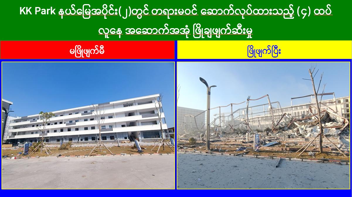 မြန်မာနိုင်ငံအစိုးရအနေဖြင့် အွန်လိုင်းလိမ်လည်လောင်းကစားမှုများ အများဆုံးအခြေချလုပ်ကိုင်လျက်ရှိကြသည့် ရွှေကုက္ကိုလ်နယ်မြေနှင့် KK Park နယ်မြေများရှိ တရားမဝင် အဆောက်အအုံများအတွင်း ဝင်ရောက်ရှင်းလင်း၍ အွန်လိုင်းလိမ်လည်လောင်းကစားမှုလုပ်ငန်းစဉ်များတွင် အသုံးပြုခဲ့သည့် သိမ်းဆည်းရမိပစ္စည်းများအား စနစ်တကျ ဖျက်ဆီးခြင်းနှင့် တရားမဝင်အဆောက်အအုံများအား စနစ်တကျဖြိုချဖျက်ဆီးခြင်းများကို အဖွဲ့စုံပါဝင်သည့် ပူးပေါင်းအဖွဲ့ဖြင့် ဆောင်ရွက်လျက်ရှိရာ ယနေ့တွင်လည်း KK Park နယ်မြေအတွင်းရှိ တရားမဝင်အဆောက်အအုံ ၆ လုံးကို ထပ်မံဖြိုချဖျက်ဆီးခဲ့ကြောင်း သိရှိရသည်။