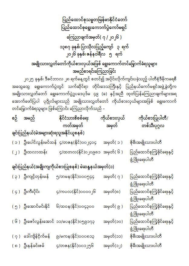 အမျိုးသားလွှတ်တော်ကိုယ်စားလှယ်အဖြစ် ရွေးကောက်တင်မြှောက်ခံရသူများ အမည်စာရင်းကြေညာခြင်း