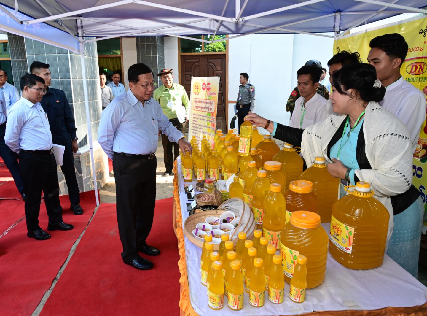 ထို့နောက် နိုင်ငံတော်ယာယီသမ္မတ နိုင်ငံတော်လုံခြုံရေးနှင့် အေးချမ်းသာယာရေးကော်မရှင်ဥက္ကဋ္ဌသည် ခင်းကျင်းပြသထားသည့် ပန်းတောင်းမြို့နယ်အတွင်းရှိ အသေးစား၊ အငယ်စားနှင့် အလတ်စားစီးပွားရေး (MSME) လုပ်ငန်းများမှ ထွက်ရှိသည့် ထုတ်ကုန်ပစ္စည်းများအား စိတ်ပါဝင်စားစွာဖြင့် လှည့်လည်ကြည့်ရှုပြီး တာဝန်ရှိသူများ၏ တင်ပြချက်များအပေါ် လိုအပ်သည်များ လမ်းညွှန်မှာကြားခဲ့ကြောင်း သတင်းရရှိသည်။