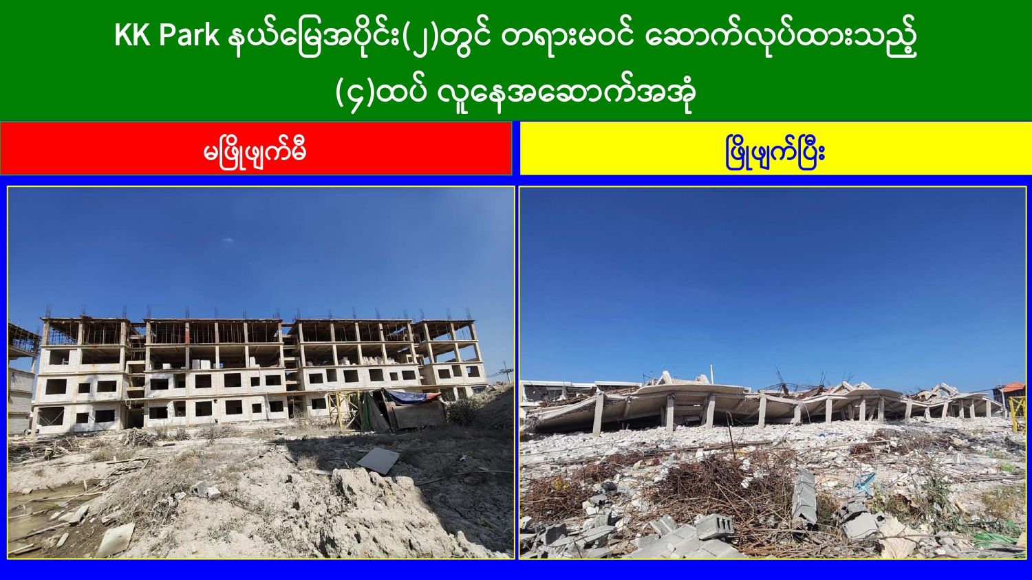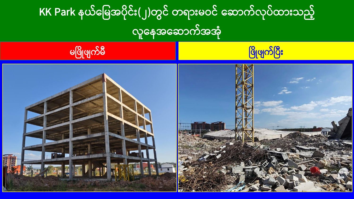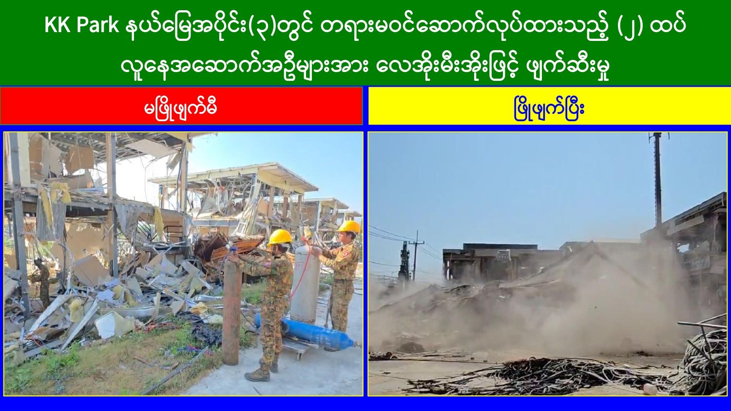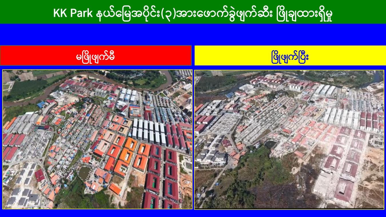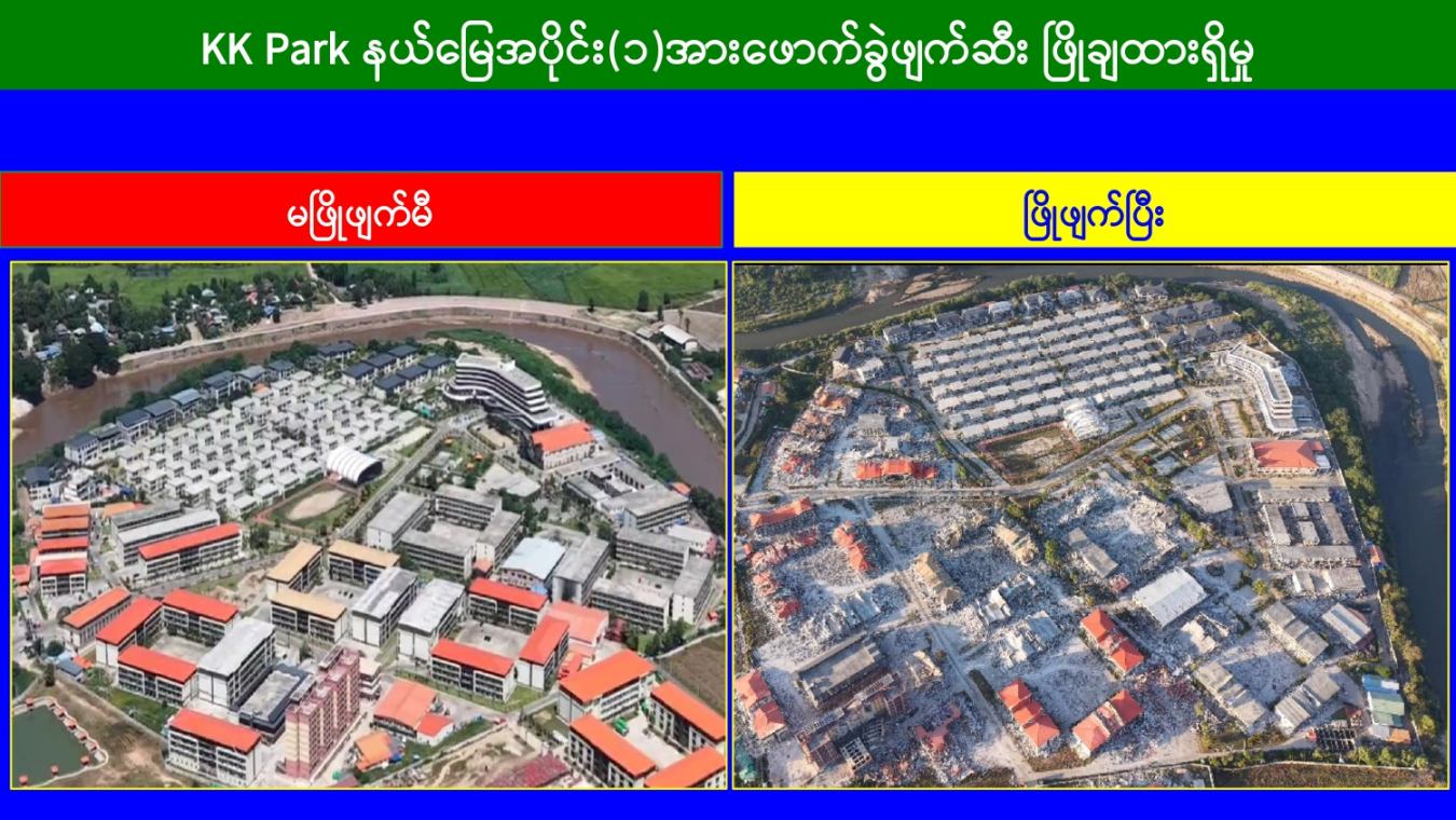 မြန်မာနိုင်ငံအစိုးရအနေဖြင့် အွန်လိုင်းလိမ်လည်လောင်းကစားမှုများ အများဆုံး အခြေချလုပ်ကိုင်လျက်ရှိကြသည့် ရွှေကုက္ကိုလ်နယ်မြေနှင့် KK Park နယ်မြေများရှိတရားမဝင် အဆောက်အအုံများအတွင်း ဝင်ရောက်ရှင်းလင်း၍ အွန်လိုင်းလိမ်လည် လောင်းကစားမှုလုပ်ငန်းစဉ်များတွင် အသုံးပြုခဲ့သည့် သိမ်းဆည်းရမိပစ္စည်းများအား စနစ်တကျဖျက်ဆီးခြင်းနှင့် တရားမဝင်အဆောက်အအုံများအား စနစ်တကျဖြိုချဖျက်ဆီးခြင်းများကို အဖွဲ့စုံပါဝင်သည့် ပူးပေါင်းအဖွဲ့ဖြင့် ဆောင်ရွက်လျက်ရှိရာ ယနေ့တွင်လည်း KK အဖွဲ့စုံပါဝင်သည့် Park နယ်မြေအတွင်းရှိ တရားမဝင်အဆောက်အအုံ ၂ လုံးကို ထပ်မံဖြိုချဖျက်ဆီးခဲ့ကြောင်း သိရှိရသည်။