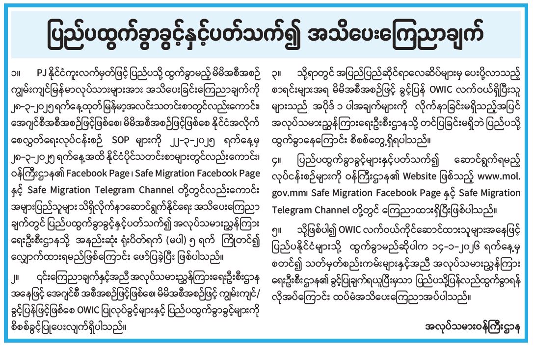 ပြည်ပထွက်ခွာခွင့်နှင့်ပတ်သက်၍ အသိပေးကြေညာချက်