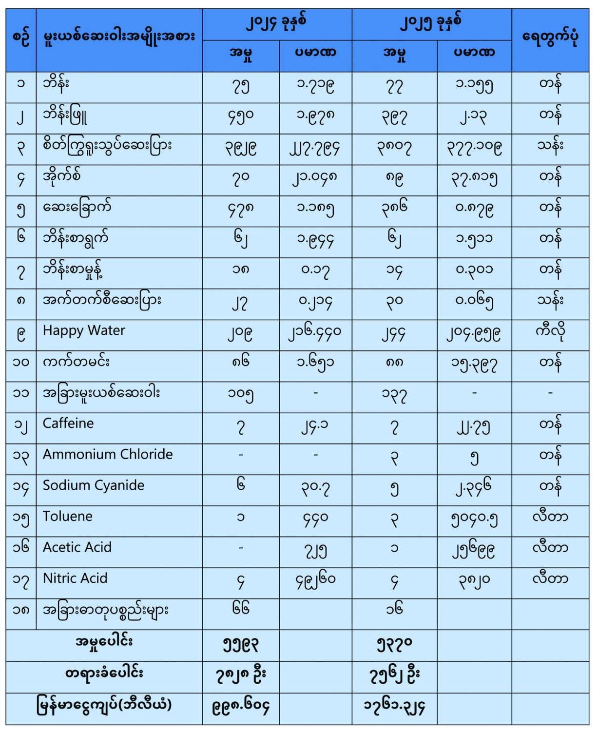 အလားတူ မူးယစ်ဆေးဝါးထုတ်လုပ်ရာတွင် အသုံးပြုရန် တရားမဝင်တင်သွင်းလာသည့် ထိန်းချုပ်ဓာတုပစ္စည်း Caffeine ၂၂ ဒသမ ၇ တန်ကျော်၊ Acetone ၉၆၀ လီတာ၊ Toluene ၅၀၄၀ လီတာကျော်၊ Ammonium Chloride ၅ တန်၊ Sodium Cyanide ၂ တန်ကျော်၊ အခြားဓာတုပစ္စည်းများဖြစ်သည့် Sodium Carbonate ၅ တန်၊ Acetic Acid ၂၅၆၀၀ လီတာကျော်၊ Nitric Acid ၃၈၂၀ လီတာအပါအဝင် ထိန်းချုပ်ဓာတုပစ္စည်းများနှင့် အခြားဓာတုပစ္စည်းများအား ဖမ်းဆီးရမိခဲ့ပြီး ရှမ်းပြည်နယ် (မြောက်ပိုင်း) မိုင်းရယ်မြို့နယ် ပုံတတ်ကျေးရွာအနီး၌ ဘိန်းချက်စခန်းတစ်ခုကို ဆက်စပ်ပစ္စည်းများနှင့်လည်းကောင်း၊ ရှမ်းပြည်နယ် (အရှေ့ပိုင်း) တာချီလိတ်မြို့နယ် မိုင်းဟဲ (အောက်) ကျေးရွာအနီး၌ စိတ်ကြွရူးသွပ်ဆေးပြား ထုတ်လုပ်သည့်စခန်းနှစ်ခုကို ဆက်စပ်ပစ္စည်းများနှင့်လည်းကောင်း၊ တာချီလိတ်မြို့နယ် ဝမ်ကောင်းမွန်ကျေးရွာရှိ နေအိမ်မှ ဆေးပြားရိုက်စက်နှင့် ဆက်စပ်ပစ္စည်းများကိုလည်းကောင်း ဖော်ထုတ်ဖမ်းဆီးအရေးယူနိုင်ခဲ့သည်။