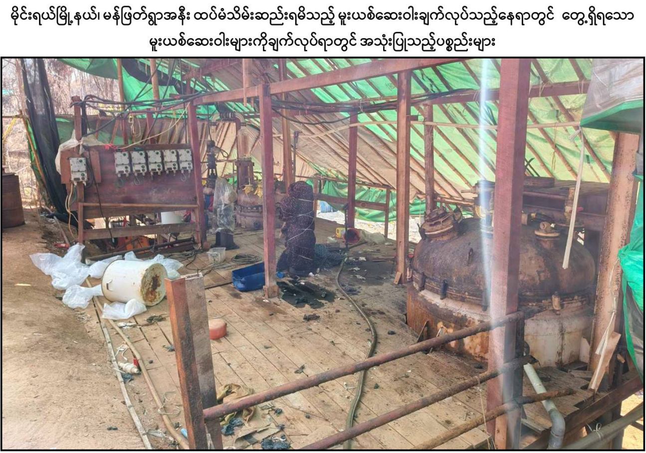 အဆိုပါ သိမ်းဆည်းရမိမှုများနှင့်ဆက်စပ်၍ လုံခြုံရေးပူးပေါင်းအဖွဲ့များက လေကြောင်းကင်းထောက်ခြင်း၊ မြေပြင်သတင်းစုံစမ်းဖော်ထုတ်ခြင်းနှင့် နယ်မြေရှင်းလင်းခြင်းတို့ကို ဆက်လက်ဆောင်ရွက်ခဲ့ရာ ဇန်နဝါရီ ၁၆ ရက် ယနေ့နံနက် ၇ နာရီ ၃၀ မိနစ်ခန့်တွင် ရှမ်းပြည်နယ်(မြောက်ပိုင်း)၊ မိုင်းရယ်မြို့၏ အနောက်တောင်ဘက် ၁၉ ကီလိုမီတာခန့်အကွာ၊ မန်ဖြတ်ကျေးရွာ၏ အနောက်မြောက်ဘက် ၁၅ ကီလိုမီတာခန့်အကွာ၌ မသင်္ကာဖွယ်ရာအဆောက်အအုံများတွေ့ရှိရသဖြင့် သွားရောက်ရှင်းလင်းခဲ့ရာ မူးယစ်ဆေးဝါးချက်လုပ်ရာတွင် အသုံးပြုသည့် အလျား ၂၀ ပေ၊ အနံ ၄၀ ပေရှိအဆောက်အအုံ ၁ လုံး၊ အလျား ၅၀ ပေ၊ အနံ ၂၀ ပေရှိ လူနေတဲ ၁ လုံး၊ မူးယစ်ဆေးဝါးရောစပ်သည့် စတီးဗန်း ၆ ခုပါ အဆောက်အအုံ ၁ လုံး၊ အလျား ၁၂၀ ပေ၊ အနံ ၄၀ ပေရှိ အဆောက်အအုံ ၁ လုံး၊ အခြောက်ခံမွှေစက် ၂ လုံး၊ မူးယစ်ဆေးဝါး အဖြူရောင်အမှုန့်များထားရှိသည့် ဂိုဒေါင် ၁ လုံး၊ အလျား ၁၂၀ ပေ၊ အနံ ၂၀ ပေရှိ လူနေအဆောက်အအုံ ၁ လုံး၊ မီးစက်ကြီး ၅ လုံး၊ Loader ၁ စီး၊ Bulldozer ၁ စီး၊ အပြာရောင် ပေပါအခွံ ၁၀၀ လုံး၊ ပုံးအဖြူရောင် ၅၀ လုံး၊ ဂက်စ်အိုး ၄၀ လုံး၊ စိစစ်ဆဲဓာတုဗေဒပစ္စည်းထည့်ထားသော အိတ် ၅၀ လုံးခန့်တို့အား ထပ်မံတွေ့ရှိသိမ်းဆည်းခဲ့သည်။