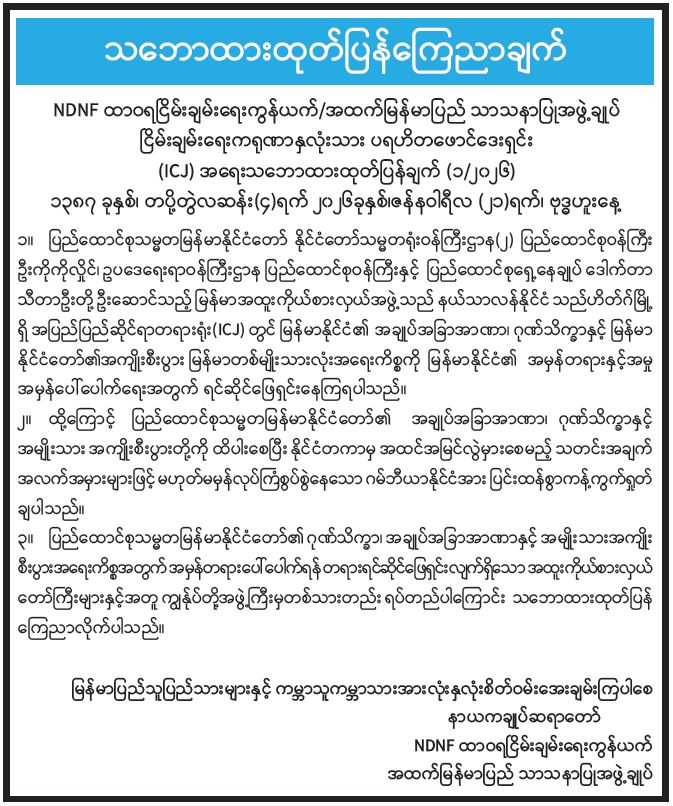 NDNF ထာဝရငြိမ်းချမ်းရေးကွန်ယက်/အထက်မြန်မာပြည် သာသနာပြုအဖွဲ့ချုပ် ငြိမ်းချမ်းရေးကရုဏာနှလုံးသား ပရဟိတဖောင်ဒေးရှင်း (ICJ) အရေးသဘောထားထုတ်ပြန်ချက် (၁/၂၀၂၆)