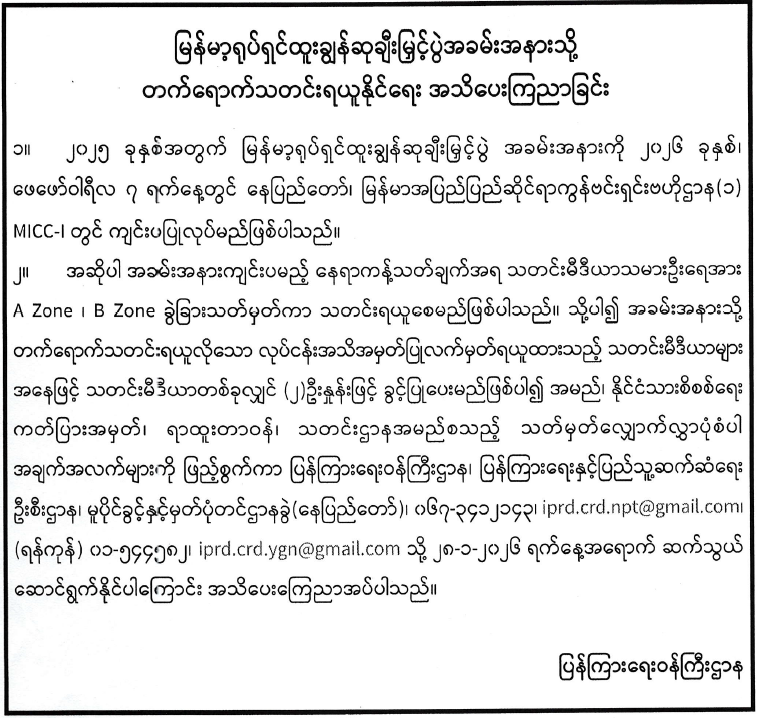 ၂။ အဆိုပါ အခမ်းအနားကျင်းပမည့် နေရာကန့်သတ်ချက်အရ သတင်းမီဒီယာသမားဦးရေအား A Zone ၊ B Zone ခွဲခြားသတ်မှတ်ကာ သတင်းရယူစေမည်ဖြစ်ပါသည်။ သို့ပါ၍ အခမ်းအနားသို့ တက်ရောက်သတင်းရယူလိုသော လုပ်ငန်းအသိအမှတ်ပြုလက်မှတ်ရယူထားသည့် သတင်းမီဒီယာများအနေဖြင့် သတင်းမီဒီယာတစ်ခုလျှင် (၂)ဦးနှုန်းဖြင့် ခွင့်ပြုပေးမည်ဖြစ်ပါ၍ အမည်၊ နိုင်ငံသားစိစစ်ရေးကတ်ပြားအမှတ်၊ ရာထူးတာဝန်၊ သတင်းဌာနအမည်စသည့် သတ်မှတ်လျှောက်လွှာပုံစံပါ အချက်အလက်များကို ဖြည့်စွက်ကာ ပြန်ကြားရေးဝန်ကြီးဌာန၊ ပြန်ကြားရေးနှင့်ပြည်သူ့ဆက်ဆံရေးဦးစီးဌာန၊ မူပိုင်ခွင့်နှင့်မှတ်ပုံတင်ဌာနခွဲ(နေပြည်တော်)၊ ၀၆၇-၃၄၁၂၁၄၃၊ iprd.crd.npt@gmail.com ၊ (ရန်ကုန်) ၀၁-၅၄၄၅၈၂ ၊ iprd.crd.ygn@gmail.com သို့ ၂၈-၁-၂၀၂၆ ရက်နေ့အရောက် ဆက်သွယ်ဆောင်ရွက်နိုင်ပါကြောင်း အသိပေးကြေညာအပ်ပါသည်။