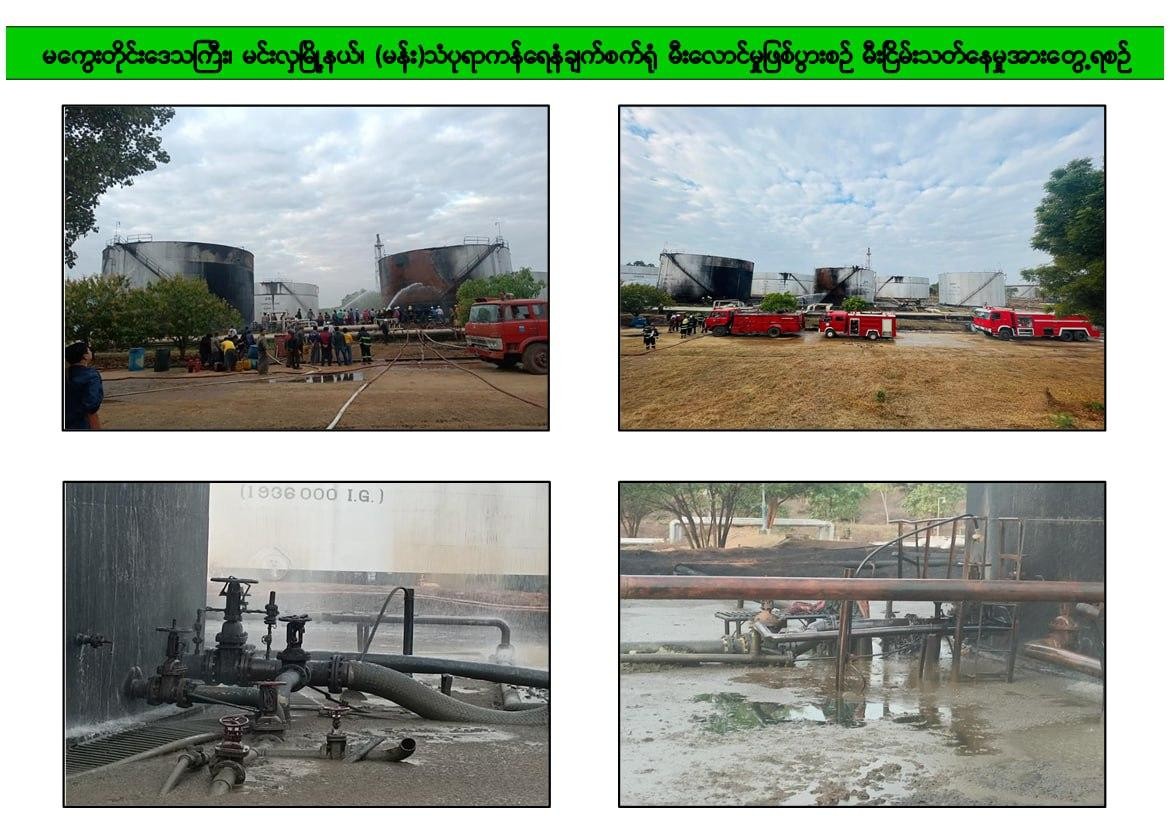 မီးလောင်ကျွမ်းမှုဖြစ်စဉ် ဖြစ်ပွားခဲ့သည့် ရေနံစိမ်းလက်ခံသိုလှောင်ကန်အခြေအနေများအား စက်ရုံမှူးမှ တင်ပြခဲ့ရာ သိုလှောင်ကန်နံရံများသာ မီလောင်ကျွမ်းခဲ့ပြီး သံကန်အတွင်းသိုလှောင်ထားသည့် ရေနံစိမ်းများ ပျက်စီးဆုံးရှုံးမှုမရှိပါကြောင်း၊ လက်ရှိမီးလောင်မှုဖြစ်ပွားခဲ့သည့် သိုလှောင်ကန်နှစ်ကန်အား အသုံးမပြုဘဲ အခြားရေနံစိမ်းသိုလှောင်ကန်များအား အသုံးပြုပြီး ထုတ်လုပ်ခြင်းလုပ်ငန်းများ ဆောင်ရွက်သွားမည်ဖြစ်ပါကြောင်း၊ စက်ရုံနှင့် ရေနံသိုလှောင်ကန်များ ပျက်စီးဆုံးရှုံးမှုမရှိဘဲ ရေနံစိမ်းသိုလှောင်ခြင်းနှင့် ထုတ်လုပ်ခြင်းလုပ်ငန်းများအား ပုံမှန်အတိုင်း လည်ပတ်ဆောင်ရွက်လျက်ရှိကြောင်း၊ ပြင်ပရှိဆက်သွယ်ထားသည့် ပိုက်လိုင်းအနည်းငယ်သာပျက်စီးသွားပြီး ပိုက်လိုင်းအတွင်းရှိ ပိုက်လိုင်းကျန်ရေနံစိမ်း ခန့်မှန်းဂါလံ ၃၅ဝ ခန့်သာ ဆုံးရှုံးခဲ့ပါကြောင်း၊ ပြင်ပရှိပိုက်လိုင်းများ ပျက်စီးမှုများကိုလည်း အမြန်ဆုံးပြုပြင်ဆောင်ရွက်နိုင်ရေး စီမံဆောင်ရွက်လျက်ရှိပါကြောင်း ရှင်းလင်းတင်ပြခဲ့သည်။