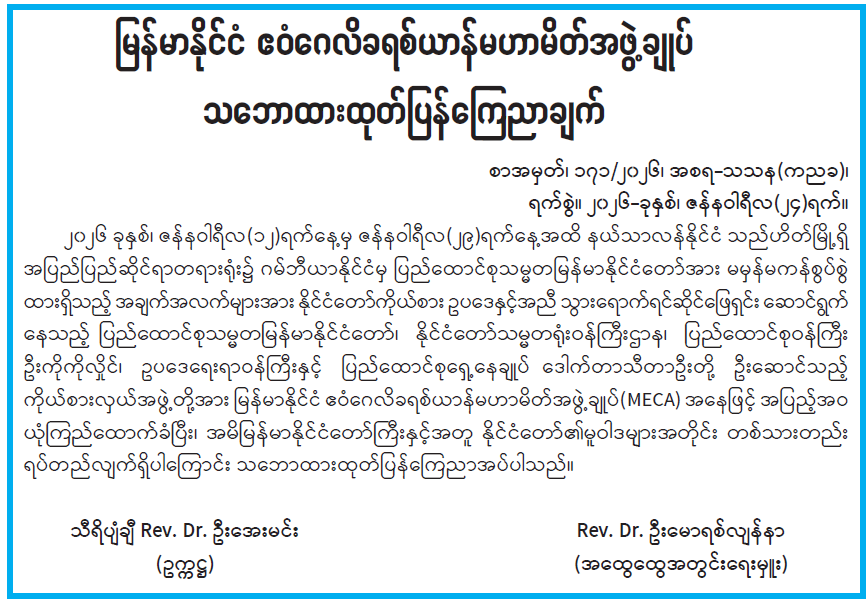 မြန်မာနိုင်ငံ ဧဝံဂေလိခရစ်ယာန်မဟာမိတ်အဖွဲ့ချုပ် သဘောထားထုတ်ပြန်ကြေညာချက်