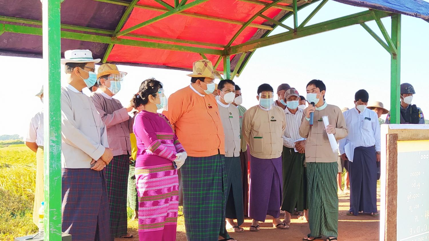 ဧရာဝတီတိုင်းဒေသကြီး ဝန်ကြီးချုပ် ဦးလှမိုးအောင်သည် တိုင်းဒေသကြီး အစိုးရအဖွဲ့ဝင်ဝန်ကြီးများ၊ တိုင်းဒေသကြီး အစိုးရအဖွဲ့ အတွင်းရေးမှူး၊ တိုင်းဒေသကြီး၊ ခရိုင်၊ မြို့နယ်အဆင့် ဌာနဆိုင်ရာများမှ တာဝန်ရှိသူများ လိုက်ပါလျက် ယနေ့ နံနက် ၈ နာရီခွဲအချိန်က ကန်ကြီးထောင့်မြို့နယ်၊ ဝါးဒူးကျေးရွာအုပ်စု၊ ဝါးဒူးကျေးရွာ၊ ကွင်းအမှတ် (၁၅၃-စီ)၊ ဦးပိုင်အမှတ် (၂၈/၆) တောင်သူ ဦးနေစိုး၏ လယ်မြေတွင် ကျင်းပပြုလုပ်သော ၂၀၂၀ ပြည့်နှစ် မိုးစပါးစံကွက် ရိတ်သိမ်းပွဲ အခမ်းအနားသို့ တက်ရောက် ကြည့်ရှု အားပေးပြီး ဒေသခံတောင်သူများနှင့် တွေ့ဆုံခဲ့သည်။