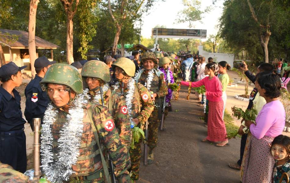 တိုင်းဒေသကြီးနှင့် ပြည်နယ်အသီးသီးရှိ တိုင်းရင်းသားပြည်သူများ စိတ်အေးချမ်းသာစွာ နေထိုင်လုပ်ကိုင်စားသောက်နိုင်ရေးနှင့် အသက်အိုးအိမ်စည်းစိမ်ဥစ္စာလုံခြုံမှုရှိစေရေး၊ နိုင်ငံတော်တည်ငြိမ်ရေး၊ နယ်မြေအေးချမ်းရေးအတွက် ရှေ့တန်းစစ်မျက်နှာများတွင် စစ်ဆင်ရေးတာဝန်များကို မိဝေးဖဝေး၊ မိသားစုများနှင့် ဝေးကွာ၍ နေ့မအား ညမနား စွမ်းစွမ်းတမံတာဝန်ထမ်းဆောင်ခဲ့ပြီး ရွပ်ရွပ်ချွံချွံတိုက်ပွဲဝင်၍ အောင်ပွဲအလီလီရယူနိုင်ခဲ့သော အောင်ပွဲရရှေ့တန်းပြန် တပ်မတော်သားများအား တိုင်းမှူးနှင့် တာဝန်ရှိသူများ၊ ဒေသခံပြည်သူများ၊ ကျောင်းသား/ကျောင်းသူများက အောင်သပြေခက်များဖြင့်လည်းကောင်း၊ ဘင်ခရာ၊ အတီး၊ အမှုတ်၊ အကအလှများဖြင့်လည်းကောင်း ဝမ်းမြောက်စွာ သောင်းသောင်းဖြဖြကြိုဆိုဂုဏ်ပြုခဲ့ကြပြီး တိုင်းမှူးက အောင်ပွဲရရှေ့တန်းပြန်တပ်မတော်သားများအား ဂုဏ်ပြုချီးမြှင့်ငွေများ ပေးအပ်ခဲ့ကြောင်း သတင်းရရှိသည်။