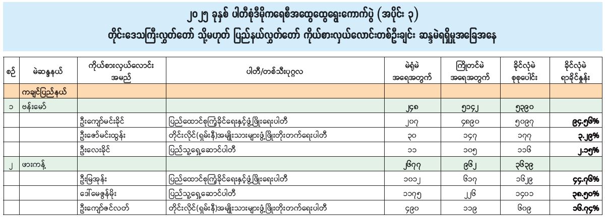 ၂၀၂၅ ခုနှစ် ပါတီစုံဒီမိုကရေစီအထွေထွေရွေးကောက်ပွဲ (အပိုင်း ၃) တိုင်းဒေသကြီးလွှတ်တော် သို့မဟုတ် ပြည်နယ်လွှတ်တော် ကိုယ်စားလှယ်လောင်းတစ်ဦးချင်း ဆန္ဒမဲရရှိမှုအခြေအနေ 01/31/2026