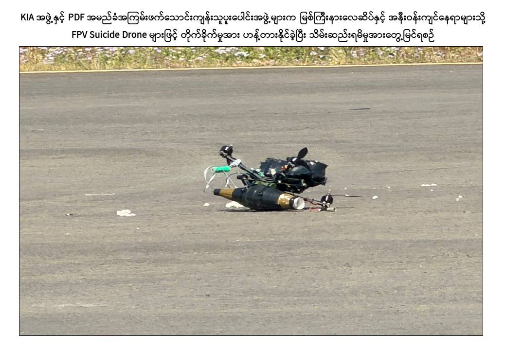 ထိုသို့ ဆောင်ရွက်လျက်ရှိရာ အကြမ်းဖက်သောင်းကျန်းသူပူးပေါင်းအဖွဲ့များက ယနေ့နံနက်ပိုင်းတွင် ကချင်ပြည်နယ်၊ မြစ်ကြီးနားမြို့၊ ပန်းမတီးရပ်ကွက်ရှိ မြစ်ကြီးနားလေဆိပ်နှင့် အနီးဝန်ကျင်နေရာများသို့ FPV Suicide Drone များအသုံးပြု၍ တိုက်ခိုက်ခဲ့ရာ လေကြောင်းလုံခြုံရေးတာဝန်များ ထမ်းဆောင်လျက်ရှိသည့် လုံခြုံရေးတပ်ဖွဲ့ဝင်များက လေကြောင်းရန်ကာကွယ်ရေးစနစ်များဖြင့် ထောက်လှမ်းသိရှိခဲ့ပြီး အဆိုပါ Drone ယာဉ်များအား လက်ဦးမှုရယူဟန့်တားနိုင်ခဲ့သည်။ ယင်းသို့ဆောင်ရွက်နိုင်ခဲ့ခြင်းကြောင့် လေဆိပ်အတွင်း ကျရောက်ပေါက်ကွဲခြင်းမရှိဘဲ လေယာဉ်ပြေးလမ်းနှင့် အနီးဝန်းကျင်နေရာများတွင်သာ မြေပြင်ပေါ်သို့ ပျက်ကျခဲ့ပြီး လုံခြုံရေးတပ်ဖွဲ့ဝင်များက အများပြည်သူများ အန္တရာယ်ကင်းရှင်းစေရန်အတွက် Drone ယာဉ်များတွင် ပါရှိသည့် ဖောက်ခွဲဖျက်ဆီးရေးပစ္စည်းများအား စနစ်တကျ သက်မဲ့ပြုလုပ်ခြင်းများ ဆောင်ရွက်ခဲ့သည်။ ဖြစ်စဉ်တွင် လူ၊ အဆောက်အအုံနှင့် လေယာဉ်ပြေးလမ်းများ ထိခိုက်ပျက်စီးမှုမရှိခဲ့ကြောင်း သိရှိရသည်။