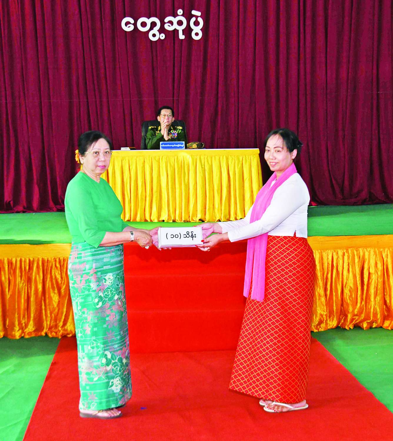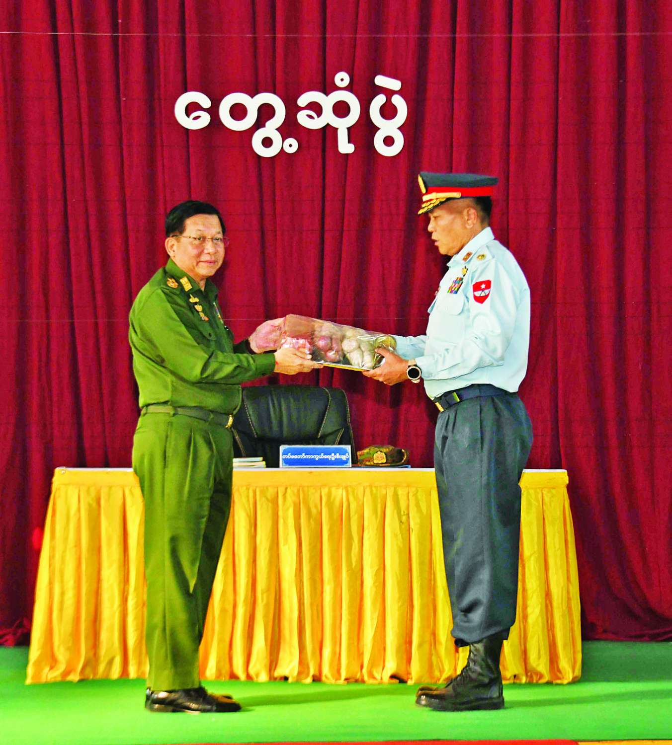 ထို့နောက် နိုင်ငံတော်လုံခြုံရေးနှင့် အေးချမ်း သာယာရေးကော်မရှင်ဥက္ကဋ္ဌ တပ်မတော်ကာကွယ်ရေးဦးစီးချုပ်က တပ်နယ်မှ အရာရှိ၊ စစ်သည်၊ မိသားစုများအတွက် စားသောက်ဖွယ်ရာပစ္စည်းများကိုပေးအပ်ရာ တပ်နယ်မှူးကလည်းကောင်း၊ နိုင်ငံတော်လုံခြုံရေးနှင့် အေးချမ်းသာယာရေးကော်မရှင်ဥက္ကဋ္ဌ တပ်မတော်ကာကွယ်ရေးဦးစီးချုပ်၏ဇနီးက တပ်နယ်မိခင်နှင့် ကလေးစောင့်ရှောက်ရေးအသင်းအတွက် ချီးမြှင့်ငွေများကိုပေးအပ်ရာ တပ်နယ်မှူး၏ဇနီးကလည်းကောင်း လက်ခံရယူသည်။