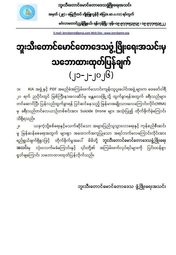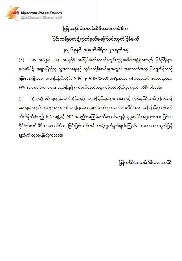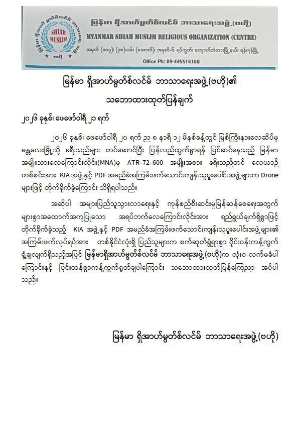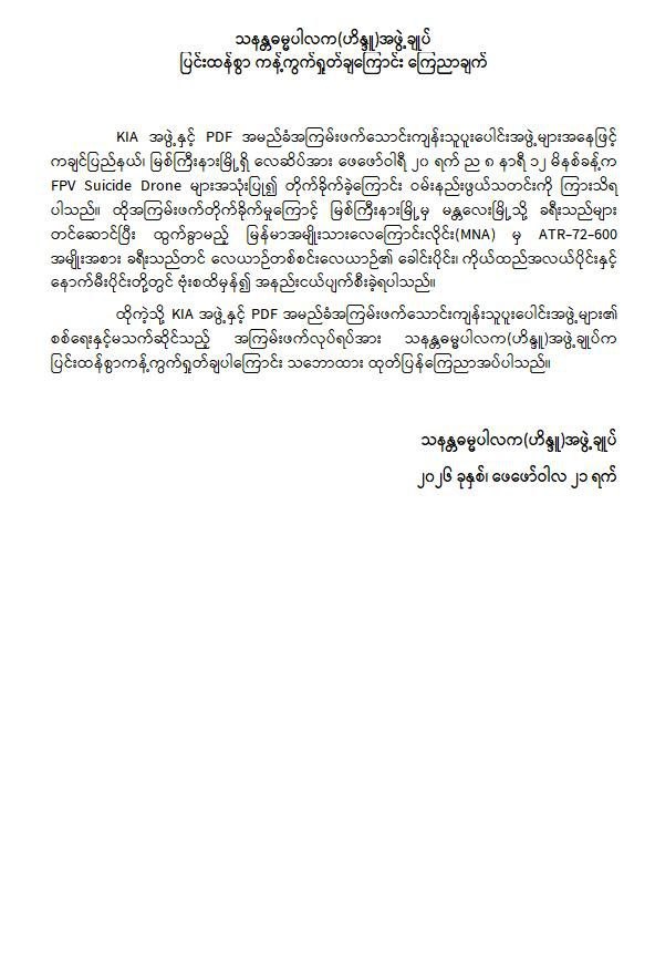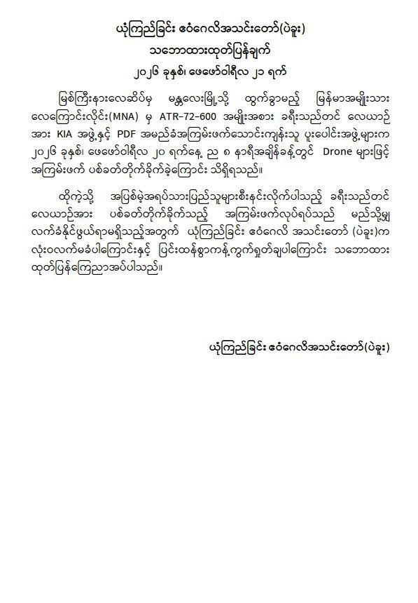 အကြမ်းဖက်အဖွဲ့များအနေဖြင့် စစ်ရေးနှင့်မသက်ဆိုင်သည့် အများပြည်သူ အသုံးပြုလျက်ရှိသော အရပ်ဘက်လေကြောင်းလိုင်းအား ရည်ရွယ်ချက်ရှိစွာဖြင့် တိုက်ခိုက်ခဲ့ခြင်းသည် ဂျီနီဗာကွန်ဗန်းရှင်းများနှင့် အပြည်ပြည်ဆိုင်ရာဥပဒေတို့အရ စစ်ရာဇဝတ်မှု (War Crime) ကို ကျူးလွန်ခြင်းဖြစ်ပြီး ၎င်းတို့၏ အကြမ်းဖက်လုပ်ရပ်များအပေါ် ဒေသခံပြည်သူများအပြင် တစ်နိုင်ငံလုံးရှိ ပြည်သူလူထုတစ်ရပ်လုံးကပါ လုံးဝလက်ခံနိုင်ခြင်းမရှိဘဲ စက်ဆုတ်ရွံရှာစွာ ဝိုင်းဝန်းကန့်ကွက်ရှုတ်ချလျက်ရှိသည်။