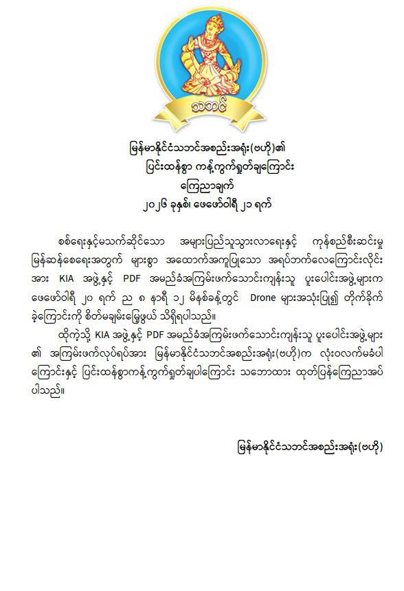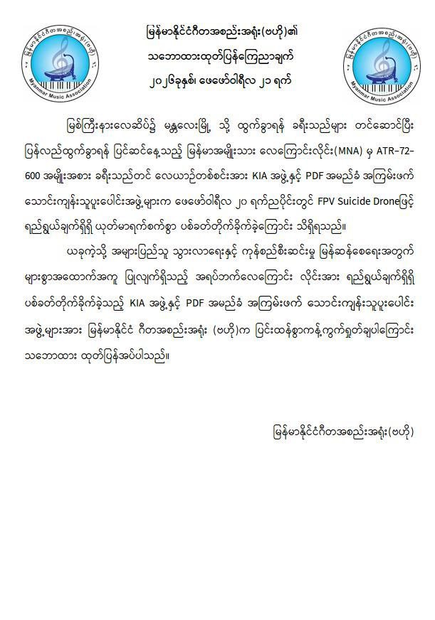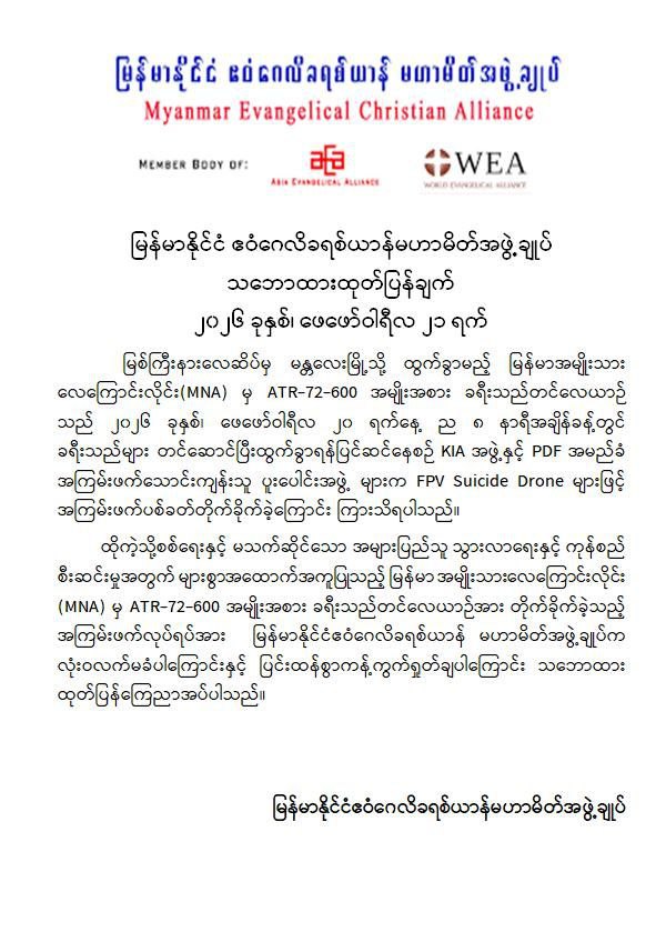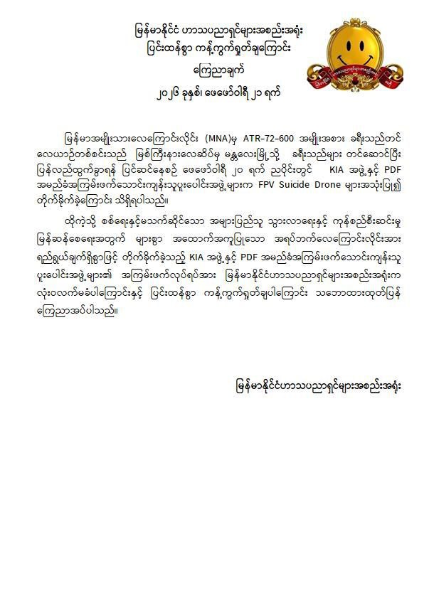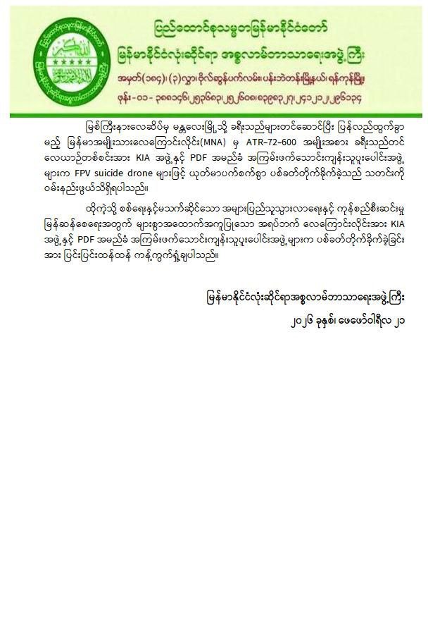အဆိုပါ ကချင်ပြည်နယ်၏ အဓိကလေကြောင်းဗဟိုချက်တစ်ခုဖြစ်သော အများပြည်သူသွားလာရေးနှင့် ကုန်စည်စီးဆင်မှုမြန်ဆန်စေရေးအတွက် များစွာအထောက်အကူပြုလျက်ရှိသည့် မြစ်ကြီးနားလေဆိပ်အား KIA အဖွဲ့နှင့် PDFအမည်ခံ အကြမ်းဖက် သောင်းကျန်းသူပူးပေါင်းအဖွဲ့များက ဖေဖော်ဝါရီ ၂၀ ရက် ည ၈ နာရီ ၁၂ မိနစ်ခန့်တွင် FPV Suicide Drone များအသုံးပြု၍ ခရီးသွားပြည်သူများ သေဆုံး၊ ထိခိုက်ဒဏ်ရာရရှိစေရန် ယုတ်မာပက်စက်သော ရည်ရွယ်ချက်ဖြင့် ပစ်ခတ်တိုက်ခိုက်ခဲ့သဖြင့် မြန်မာအမျိုးသားလေကြောင်းလိုင်း (MNA) မှ မြစ်ကြီးနားလေဆိပ်မှ မန္တလေးမြို့သို့ ထွက်ခွာရန်အတွက် ခရီးသည်များတင်ဆောင်ပြီး ပြန်လည်ထွက်ခွာရန် ပြင်ဆင်နေသည့် ATR-72-600 အမျိုးအစား ခရီးသည်တင်လေယာဉ်၏ ခေါင်းပိုင်း၊ ကိုယ်ထည်အလယ်ပိုင်းနှင့် နောက်မီးပိုင်းတို့တွင် ဗုံးစထိမှန်ပျက်စီးခဲ့ပြီး လေယာဉ်ခရီးစဉ်ရပ်နားခဲ့ရသည်။
