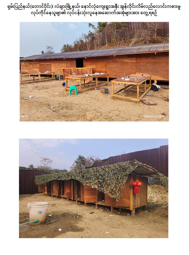 ရှမ်းပြည်နယ်(တောင်ပိုင်း)၊ လဲချားမြို့နယ်အတွင်း လုံခြုံရေးတပ်ဖွဲ့ဝင်များပါဝင်သော ပူးပေါင်းအဖွဲ့များသည် လေကြောင်းကင်းထောက်၍ နယ်မြေလုံခြုံရေးလုပ်ငန်းများကို ဆောင်ရွက်စဉ် လဲချားမြို့နယ်၊ ဝမ်ပန်ကျေးရွာအုပ်စု၊ နောင်လုံကျေးရွာ၏ အနောက်ဘက် မီတာ ၃၀၀၀ ခန့်အကွာ၌ မသင်္ကာဖွယ်အဆောက်အအုံများကို တွေ့ရှိရသဖြင့် ဖေဖော်ဝါရီ ၂၂ ရက် နေ့လယ် ၁၂ နာရီတွင် သွားရောက်ရှင်းလင်းစစ်ဆေးရာ အွန်လိုင်းလိမ်လည်လောင်းကစားမှုများ လုပ်ဆောင်နေသည့် နေရာတစ်ခုဖြစ်ကြောင်း တွေ့ရှိရပြီး အွန်လိုင်းလိမ်လည်လောင်းကစားမှုများ လုပ်ကိုင်နေကြသည့် တရုတ်နိုင်ငံသား အမျိုးသား ၂၀ ဦးကို လုပ်ငန်းများလုပ်ကိုင်ရာတွင် အသုံးပြုသည့် အလျား ၈၀ ပေ၊ အနံ ၂၀ ပေရှိ လူနေအဆောက်အအုံ ၁ လုံး၊ အလျား ၈၀ ပေ အနံ၂၀ ပေရှိအလုပ်ရုံအဆောက်အအုံ ၁ လုံး၊ အလျား ၅၀ ပေ၊ အနံ ၂၀ ပေရှိ ထမင်းစားဆောင် ၁ လုံး၊ ၁၀ ခန်းတွဲ အိမ်သာ ၁ လုံး၊ STARLINK ဗန်း ၂ ခု၊ ဆက်စပ်ပစ္စည်းများနှင့်အတူ တွေ့ရှိဖမ်းဆီးထိန်းသိမ်းခဲ့ကြောင်း သိရှိရသည်။