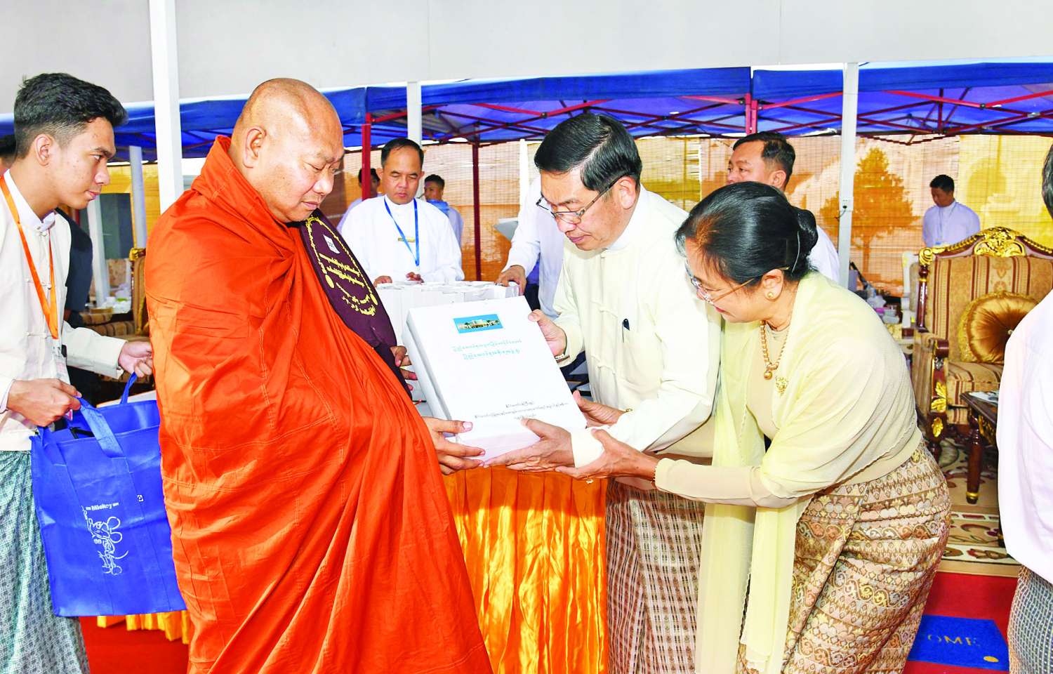 ဆက်လက်၍ ကော်မရှင်အဖွဲ့ဝင်များ၊ ပြည်ထောင်စုအဆင့်ပုဂ္ဂိုလ်များ၊ ပြည် ထောင်စုဝန်ကြီးများ၊ ကာကွယ်ရေးဦးစီးချုပ်ရုံးမှ အဆင့်မြင့်တပ်မတော်အရာရှိကြီးများနှင့် တာဝန်ရှိသူများက အဘိဓဇအဂ္ဂမဟာ သဒ္ဓမ္မ ဇောတိက၊ အဂ္ဂမဟာ ပဏ္ဍိတ၊ အဂ္ဂမဟာ သဒ္ဓမ္မဇောတိကဓဇ၊ အဂ္ဂမဟာ ဂန္ထဝါစက ပဏ္ဍိတ၊ အဂ္ဂမဟာ ကမ္မဋ္ဌာနာ စရိယဘွဲ့ရရှိသည့် ဆရာတော်ကြီးများထံ ဘွဲ့တံဆိပ်တော်နှင့် အဆောင်အယောင်များကို ဆက်ကပ်ပူဇော်ကြသည်။
