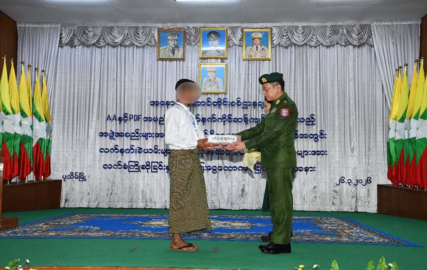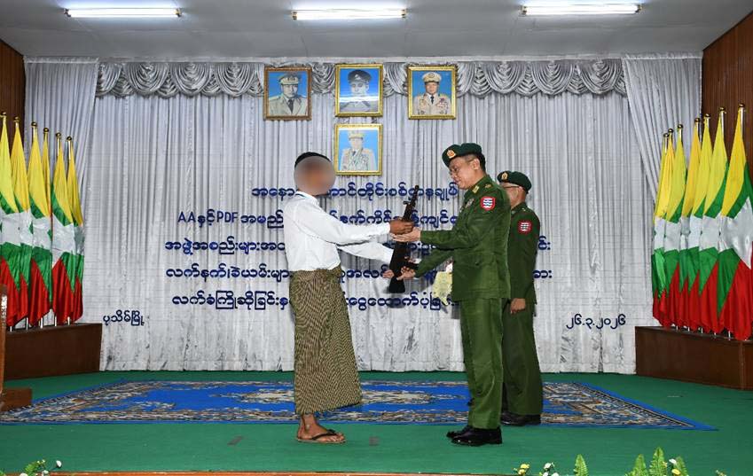 နိုင်ငံတော်အစိုးရသည် PDF အပါအဝင် အဖွဲ့အစည်းအမျိုးမျိုးအမည်ခံ၍ လက်နက်ကိုင်ဆန့်ကျင်လျက်ရှိသည့် အဖွဲ့အစည်းများအတွင်း ရောက်ရှိနေသူများအား ဥပဒေဘောင်အတွင်းသို့ ပြန်လည်ဝင်ရောက်ရန်ဖိတ်ခေါ်၍ ပြန်လည်ဝင်ရောက် လာကြသူများကိုလည်း လိုအပ်သည့် ကူညီပံ့ပိုးမှုများ ဆောင်ရွက်ပေးလျက်ရှိရာ နိုင်ငံတော်နှင့် တပ်မတော်၏ ငြိမ်းချမ်းရေးလုပ်ငန်းစဉ်များကို နားလည်သဘော ပေါက်လာသည့် PDF အဖွဲ့ဝင် အမျိုးသား ၈ ဦး၊ AA အဖွဲ့ဝင် အမျိုးသား ၁၀ ဦး၊ စုစုပေါင်း ၁၈ ဦးတို့သည် လက်နက်၊ ခဲယမ်းများနှင့်အတူ ဥပဒေဘောင်အတွင်းသို့ ဝင်ရောက်လာကြပြီး တာဝန်ရှိသူများက ကြိုဆိုလက်ခံ၍ မိဘအုပ်ထိန်းသူများထံ ပြန်လည်လွှဲပြောင်းအပ်နှံပွဲကို ယနေ့နံနက်ပိုင်းတွင် အနောက်တောင်တိုင်းစစ်ဌာနချုပ် ဧရာဝတီခန်းမ၌ ကျင်းပပြုလုပ်သည်။