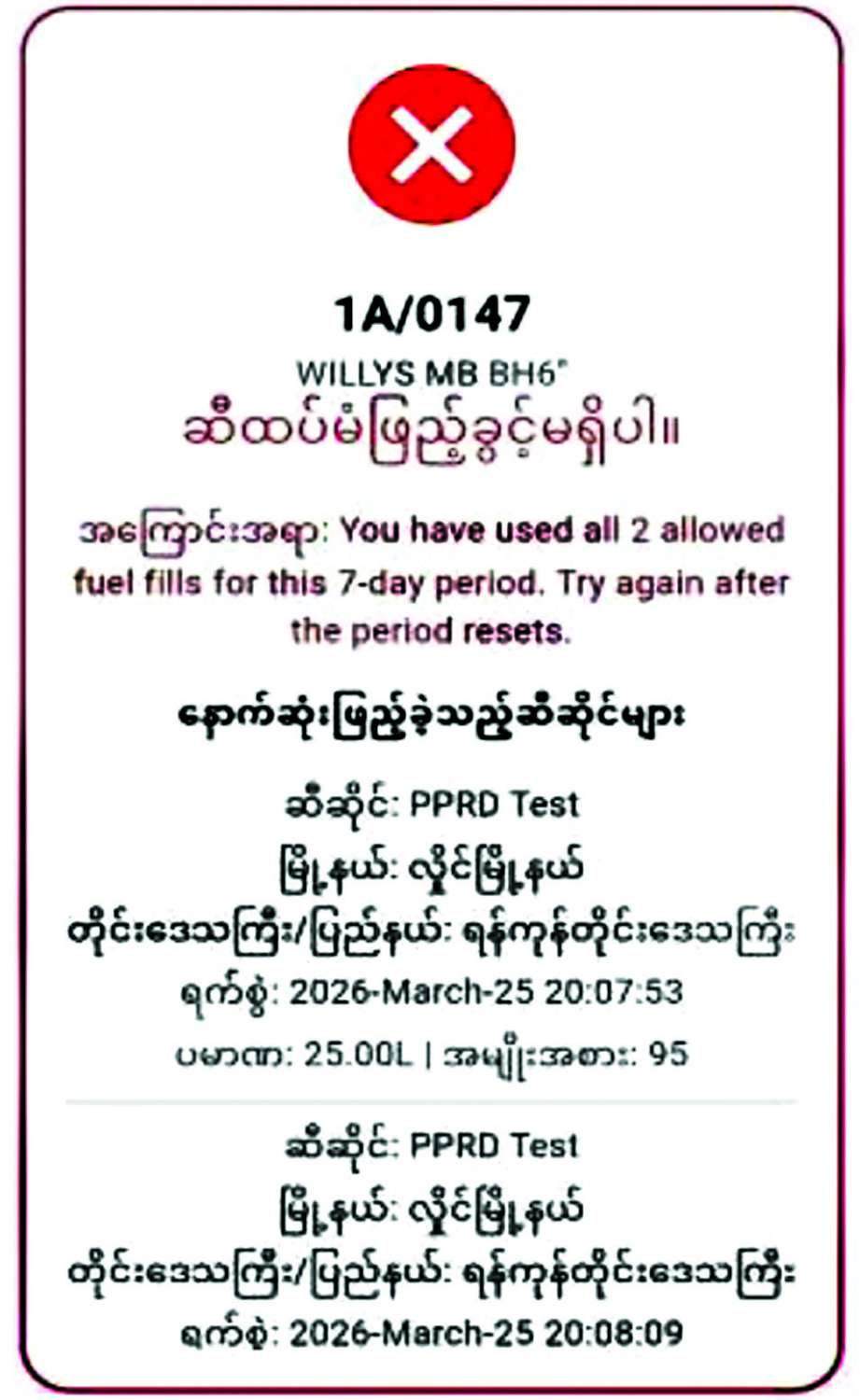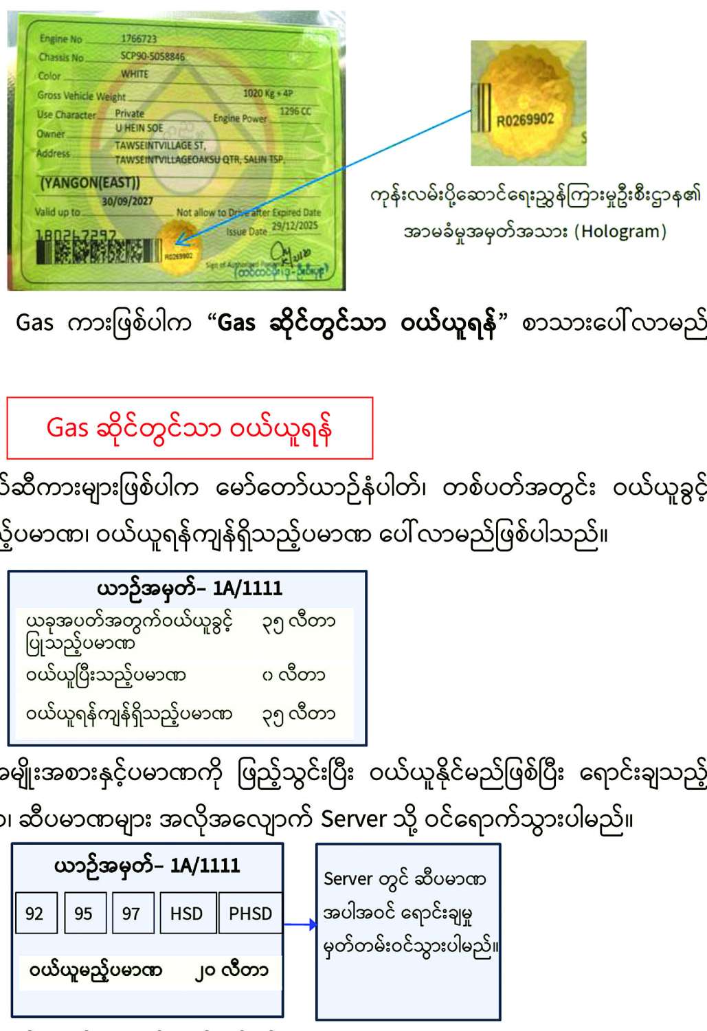 ဓာတ်ဆီ၊ ဒီဇယ်ဆီကားများဖြစ်ပါက မော်တော်ယာဉ်နံပါတ်၊ တစ်ပတ်အတွင်း ဝယ်ယူခွင့်ပမာဏ၊ ဝယ်ယူပြီးသည့်ပမာဏ၊ ဝယ်ယူရန်ကျန်ရှိသည့်ပမာဏ ပေါ်လာမည်ဖြစ်ပါသည်။