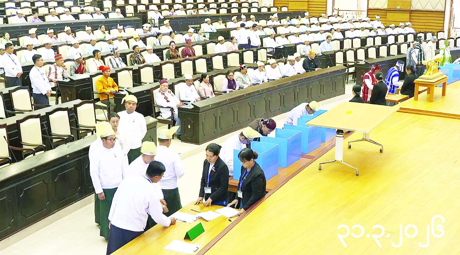 ဆက်လက်၍ အမျိုးသားလွှတ်တော်ဥက္ကဋ္ဌက ကိုယ်စားလှယ်များကို ထုတ်ပေးထားသည့် ဆန္ဒမဲလက်မှတ်အရေအတွက် ၁၅၅ မဲဖြစ်ပြီး ဆန္ဒမဲပုံးအတွင်းမှ ထုတ်ယူရရှိသည့် ဆန္ဒမဲလက်မှတ်အရေအတွက်သည် ၁၅၅ မဲဖြစ်သည့်အတွက် ကိုက်ညီမှုရှိသဖြင့် နိုင်ငံတော်သမ္မတနှင့် ဒုတိယသမ္မတများ ရွေးချယ်တင်မြှောက်ခြင်းဆိုင်ရာ နည်းဥပဒေ ၁၈၊ နည်းဥပဒေခွဲ(ဋ)၊ နည်းဥပဒေခွဲငယ် ၅ အရ ဆန္ဒမဲပေးပွဲ အထမြောက်ကြောင်း ကြေညာသည်။