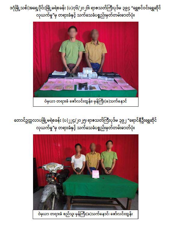 “ရွှေစင်ဝင်း”ရွှေဆိုင်နှင့် “ရောင်နီဦး”ရွှေဆိုင်တို့ကို သေနတ်ပစ်ဖောက်ခြိမ်းခြောက်၍ ရွှေထည်ပစ္စည်းများလုယက်မှုကျူးလွန်ခဲ့ကြသည့် တရားခံများအား ပြည်သူလူထုပူးပေါင်းပါဝင် ကူညီမှုဖြင့် ဖော်ထုတ်နိုင်ခဲ့ပြီး ဖမ်းဆီးရမိတရားခံ မှန်ကြီး(ခ)သက်နောင်၊ ဇော်လင်းထွန်းနှင့် စည်သူ တို့သုံးဦးကို ဥပဒေနှင့်အညီ ထိရောက်စွာ အရေးယူဆောင်ရွက်သွားမည်ဖြစ်ပြီး ကျန်တရားခံ သက်ပိုင်ဦးအား ဖမ်းဆီးရမိရေး ဆက်လက်ဆောင်ရွက်လျက်ရှိကြောင်း သတင်းရရှိသည်။
