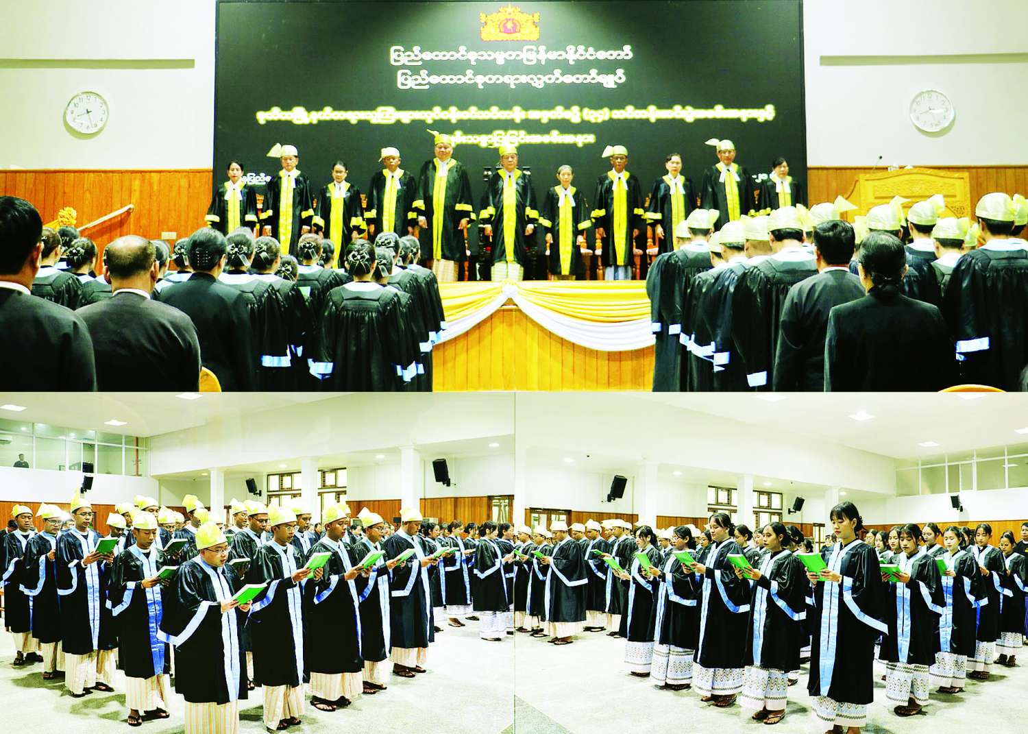 ယင်းနောက် ပြည်ထောင်စုတရားစီရင်ရေးဥပဒေ ပုဒ်မ ၂၃ ပုဒ်မခွဲ (ဂ) ပုဒ်မခွဲငယ် (၁) အရ ပြည်ထောင်စုတရားလွှတ်တော်ချုပ်သည် တရားသူကြီးအဖြစ် ရွေးချယ်ခန့်ထားခြင်းခံရသူများကို တရားသူကြီးအဖြစ် စတင်တာဝန်ပေးသည့်အချိန်တွင် ကျမ်းသစ္စာ သို့မဟုတ် ကတိသစ္စာပြုရန် စီစဉ်ဆောင်ရွက်ရမည်ဟု ပြဋ္ဌာန်းချက်နှင့်အညီ ဒုတိယမြို့နယ်တရားသူကြီးများအဖြစ် စတင်တာဝန်ထမ်းဆောင်ကြမည့် ဒုတိယမြို့နယ်တရားသူကြီးများ လုပ်ငန်းဝင်သင်တန်း အမှတ်စဉ် (၃၄) သင်တန်းသား သင်တန်းသူများက “ကျွန်တော်/ကျွန်မတို့သည် တရားသူကြီး/တရားရေးဝန်ထမ်းများအဖြစ် တာဝန်ထမ်းဆောင်ရာတွင် နိုင်ငံတော်ဖွဲ့စည်းပုံအခြေခံဥပဒေနှင့် နိုင်ငံတော်တည်ဆဲဥပဒေများကို လိုက်နာဆောင်ရွက်ပါမည်။ ထို့ပြင် တရားစီရင်ရေးလုပ်ငန်းတာဝန်များကို ထမ်းဆောင်ရာတွင် တရားသူကြီးများ လိုက်နာစောင့်ထိန်းရမည့် ကျင့်ဝတ်သိက္ခာများကို လိုက်နာစောင့်ထိန်းပြီး မှုခင်းကိစ္စများကို အဂတိတရားလေးပါးကင်းစင်စွာဖြင့် ဥပဒေနှင့်အညီ တရားမျှတ မှန်ကန်စွာစစ်ဆေးစီရင် ဆုံးဖြတ်ပါမည်ဟု လေးနက်တည်ကြည်စွာ ကျမ်းသစ္စာပြုလျက်ကြေညာပါသည်၊” ဟု ပြည်ထောင်စုတရားသူကြီးချုပ်နှင့် ပြည်ထောင်စု တရားလွှတ်တော်ချုပ်တရားသူကြီးများ ရှေ့မှောက်တွင် လေးနက်တည်ကြည်စွာ ကျမ်းသစ္စာပြုကြသည်။