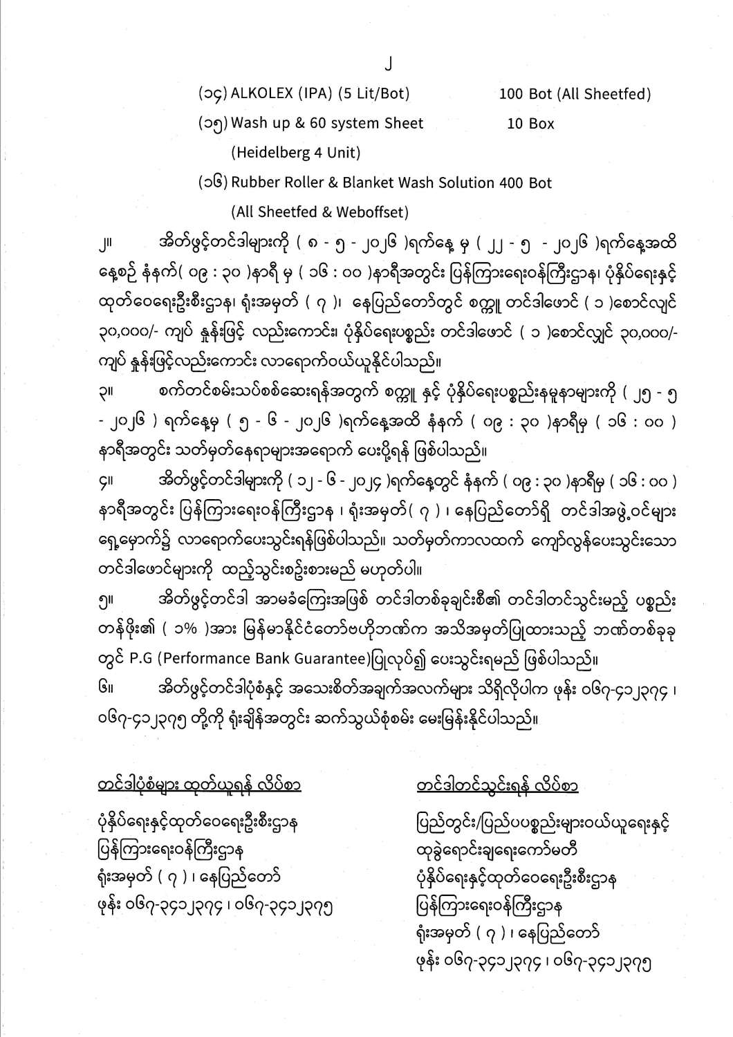 စက္ကူ နှင့် ပုံနှိပ်ရေးပစ္စည်းများဝယ်ယူရန် အိတ်ဖွင့်တင်ဒါခေါ်ယူခြင်း