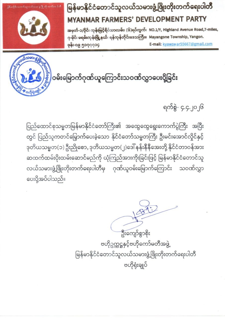 ၂၀၂၆ ခုနှစ်၊ ဧပြီလ ၃ ရက်တွင် ကျင်းပသည့် နိုင်ငံတော်သမ္မတရွေးချယ်တင်မြှောက်ပွဲ၌ ပြည်ထောင်စုလွှတ်တော်ကိုယ်စားလှယ် အားလုံးပါဝင်သော နိုင်ငံတော်သမ္မတ ရွေးချယ်တင်မြှောက်ရေးအဖွဲ့က ရွေးကောက်ခံ ပြည်သူ့လွှတ်တော်ကိုယ်စားလှယ်များ အစုအဖွဲ့မှ ဒုတိယသမ္မတအဖြစ် ရွေးချယ်တင်မြှောက်ထားသော ဗိုလ်ချုပ်မှူးကြီး မင်းအောင်လှိုင်အား နိုင်ငံတော်သမ္မတအဖြစ် ရွေးချယ်တင်မြှောက်ခြင်းခံရသည့်အတွက် အမျိုးသားဒီမိုကရေစီပါတီသစ်၊ ဗိုလ်တထောင်ကျိုက်ဒေးအပ်ဆံတော်ဦးစေတီတော် ဘဏ္ဍာတော်ထိန်းဂေါပကအဖွဲ့၊ တရုတ်-မြန်မာစီးပွားပူးပေါင်းဆောင်ရွက်ရေးနှင့်ဖွံ့ဖြိုးမှုမြှင့်တင်ရေးအသင်း (CMECDPA) ၊ မြန်မာ-ဂျပန်ချစ်ကြည်ရေးအသင်း၊ မြန်မာနိုင်ငံအမျိုးသမီးများနှင့် ကလေးသူငယ်များဘဝမြှင့်တင်ရေးအသင်း၊ မြန်မာ-ရုရှား ချစ်ကြည်ရေးအသင်း၊ မြန်မာ့ငြိမ်းချမ်းရေးနှင့်ဆင်းရဲနွမ်းပါးမှုလျော့ပါးရေးအဖွဲ့ (MPPAA) ၊ မြန်မာနိုင်ငံဆိုင်ရာ ဟူနန်ကုန်သည်ကြီးများအသင်း၊ မြန်မာနိုင်ငံဆိုင်ရာ စီချွမ်နှင့်ချုံချင့် ကုန်သည်ကြီးများအသင်းချုပ်၊ မြန်မာနိုင်ငံဆိုင်ရာ ကျန်းစုကုန်သည်ကြီးများအသင်း၊ မြန်မာနိုင်ငံဆိုင်ရာရှန်ဒုန်ကုန်သည်ကြီးများအသင်း၊ မြန်မာနိုင်ငံဆိုင်ရာကျန်းရှီးကုန်သည်ကြီးများအသင်းချုပ်၊ မြန်မာနိုင်ငံဆိုင်ရာ ဖုကျန့်ကုန်သည်ကြီးများအသင်းချုပ်၊ မြန်မာနိုင်ငံဆိုင်ရာ ကွမ်းတုန်းကုန်သည်ကြီးများအသင်းနှင့် မြန်မာနိုင်ငံဆိုင်ရာ(တရုတ်) ယူနန် ကုန်သည်ကြီးများအသင်းတို့က အထူးဂုဏ်ယူဝမ်းမြောက်ကြောင်း ကြေညာချက်များ ထုတ်ပြန်ခဲ့ကြသည်။