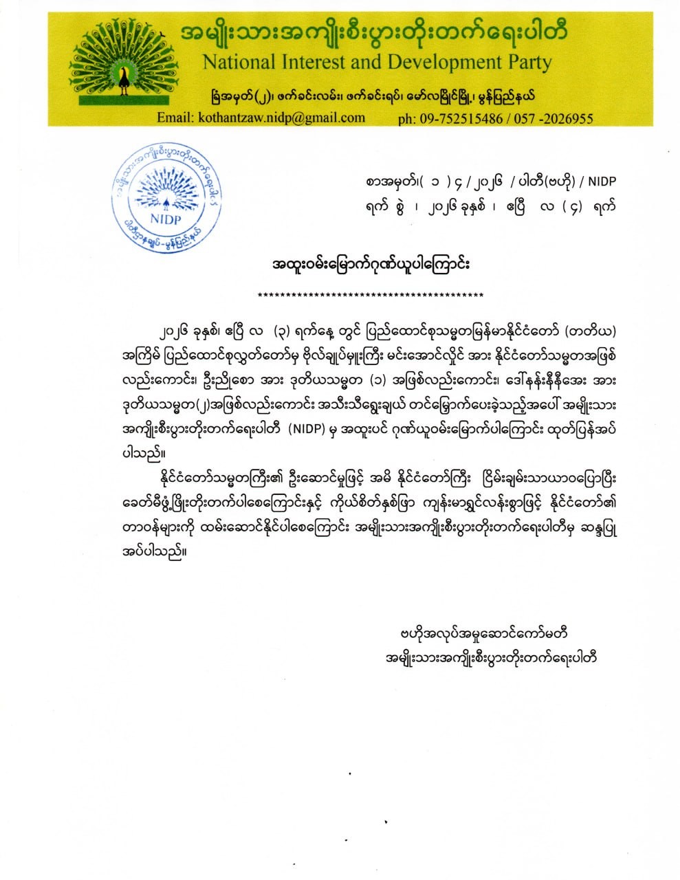 အဆိုပါ ထုတ်ပြန်ကြေညာချက်များတွင် ပြည်ထောင်စုသမ္မတမြန်မာနိုင်ငံတော်၊ နိုင်ငံတော်သမ္မတအဖြစ် ဗိုလ်ချုပ်မှူးကြီး မင်းအောင်လှိုင်အား ပြည်ထောင်စုလွှတ်တော်က ရွေးချယ်တင်မြှောက်ခဲ့သည့်အတွက် အထူးဂုဏ်ယူဝမ်းမြောက်မိပါကြောင်း၊ မြန်မာနိုင်ငံတော်ကြီး ငြိမ်းချမ်းသာယာဝပြောပြီး ခေတ်မှီဖွံ့ဖြိုးတိုးတက်ပါစေ၊ မြန်မာပြည်သူ၊ ပြည်သားများ၏ အကျိုးစီးပွားဖွံ့ဖြိုးတိုးတက်ရေးတာဝန်များ ကိုယ်စိတ်နှစ်ဖြာကျန်းမာ၊ ချမ်းသာစွာဖြင့် ထမ်းဆောင်နိုင်ပါစေကြောင်း၊ သမ္မတကြီး၏ ဦးဆောင်မှုဖြင့် ပြည်ထောင်စုသမ္မတမြန်မာနိုင်ငံတော်ကြီး ငြိမ်းချမ်းသာယာပြီး ပိုမိုဖွံ့ဖြိုးတိုးတက်ပါစေကြောင်း၊ နိုင်ငံတော်သမ္မတ ဗိုလ်ချုပ်မှူးကြီး မင်းအောင်လှိုင် စိတ်၏ချမ်းသာခြင်း၊ ကိုယ်၏ကျန်းမာခြင်းများနှင့်ပြည့်စုံပြီး ကိုယ်စိတ်နှဖြာ ကျန်းမာရွှင်လန်းစွာဖြင့် နိုင်ငံတော်၏ တာဝန်များကို ထမ်းဆောင်နိုင်ပါစေကြောင်း ဆုမွန်ကောင်းတောင်း ဂါရဝပြုအပ်ပါကြောင်း၊ ပြည်ထောင်စုသမ္မတမြန်မာနိုင်ငံတော်ကြီး ငြိမ်းချမ်းသာယာဝပြောပြီး ပိုမိုစည်ပင်ဖွံ့ဖြိုးတိုးတက်ပါစေကြောင်း စသည်ဖြင့် ပါရှိကြောင်း သိရှိရသည်။