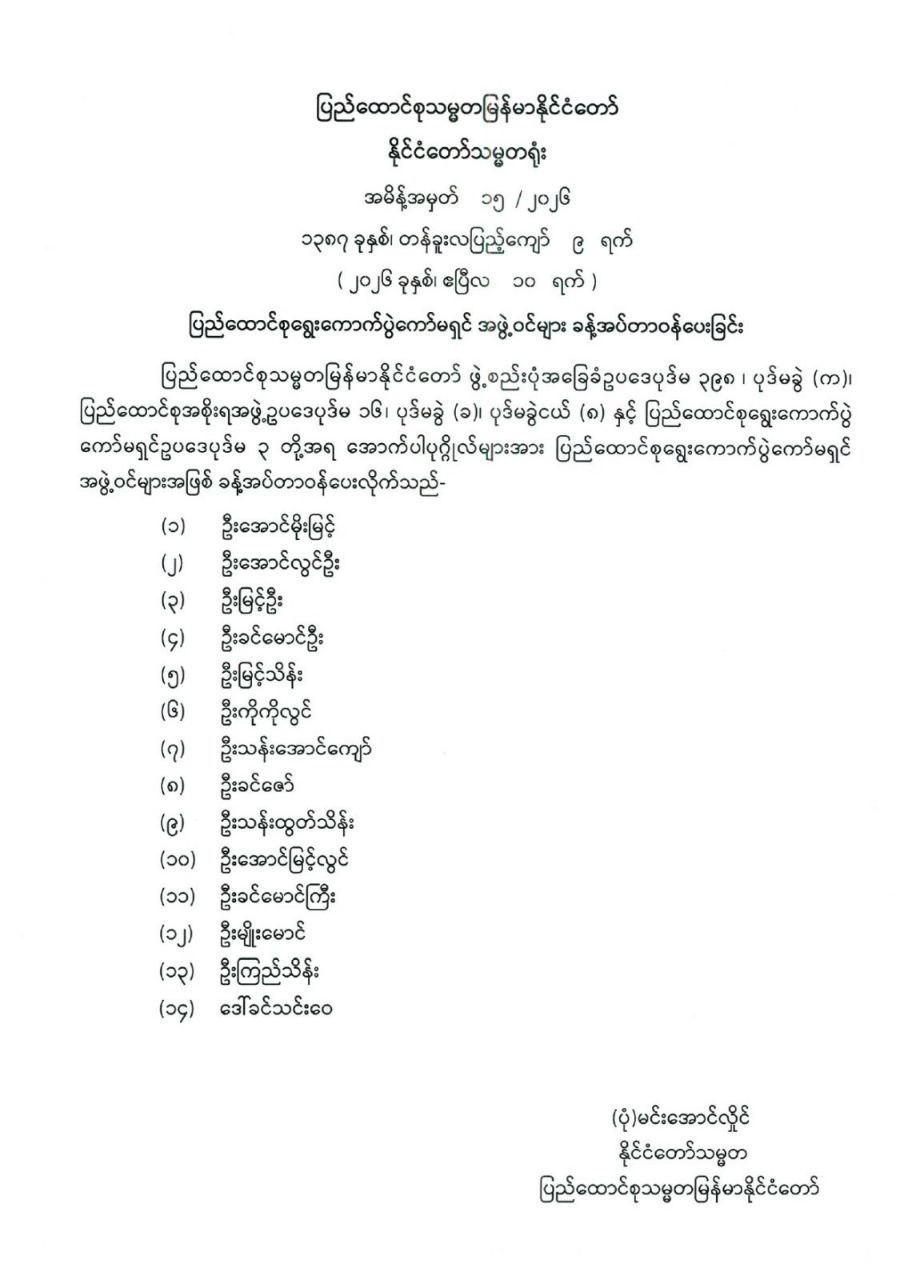 ပြည်ထောင်စုရွေးကောက်ပွဲကော်မရှင် အဖွဲ့ဝင်များ ခန့်အပ်တာဝန်ပေးခြင်း
