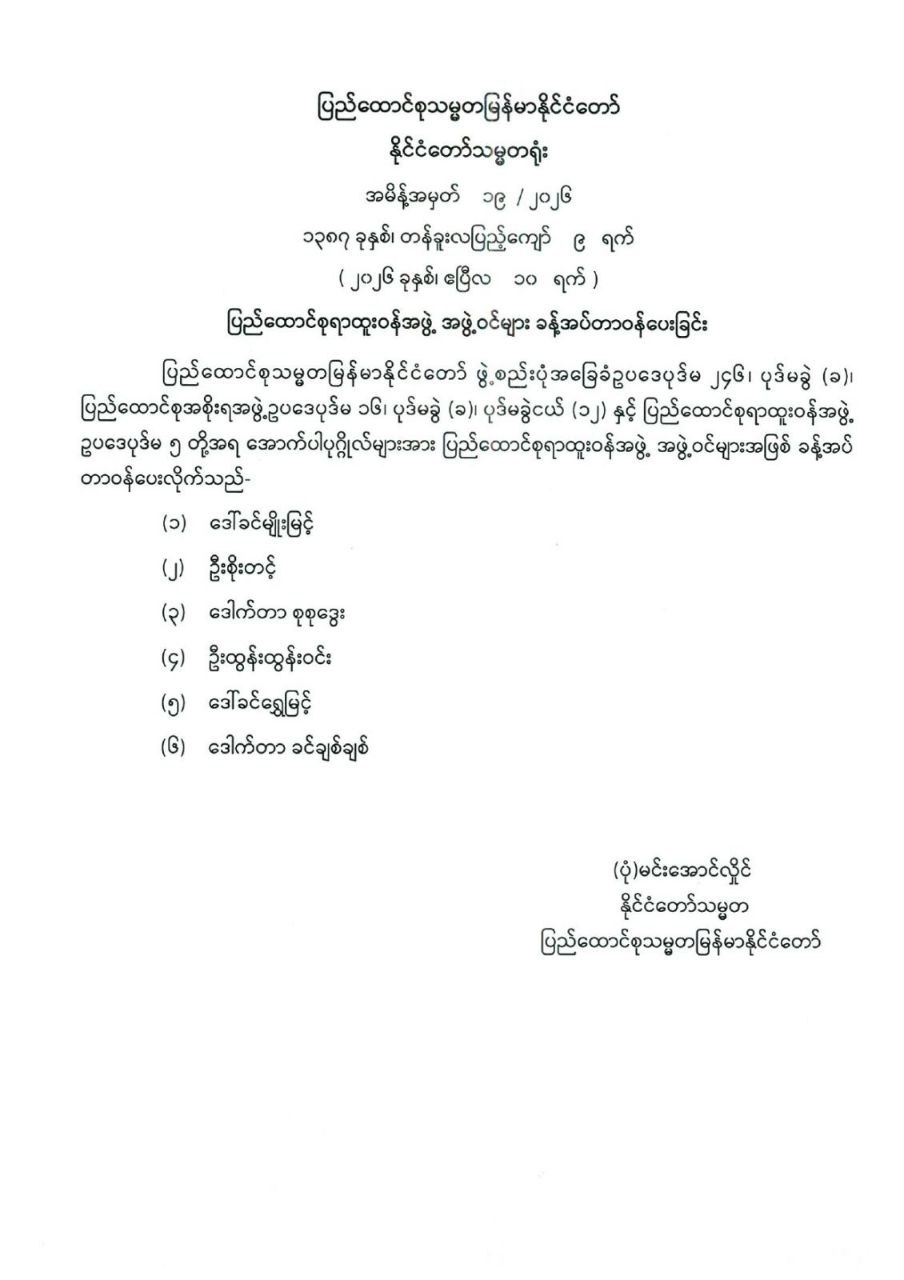 ပြည်ထောင်စုရာထူးဝန်အဖွဲ့ အဖွဲ့ဝင်များ ခန့်အပ်တာဝန်ပေးခြင်း